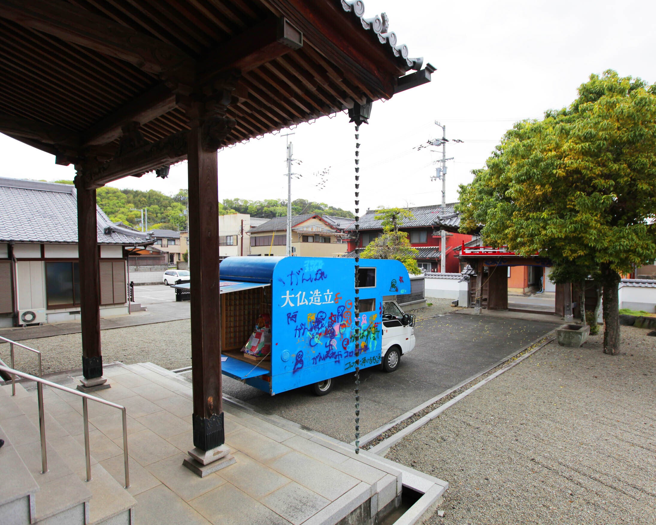 前日の安楽寺さんや、愛媛のお寺さんも紹介してくれた香川さんのお寺「一心寺」でイベントを開催。そんな香川さんも、札幌の知人に紹介してもらいました。とにかくこのキャラバンは、人と人とのつながりを最大限に活用させてもらい、なんとかここまで進んでくることができました。様々なご縁に感謝。この時は、前田さんたちが見つけてきガチャガチャのたユニークな仏像を並べて楽しんでいたことを思い出します。