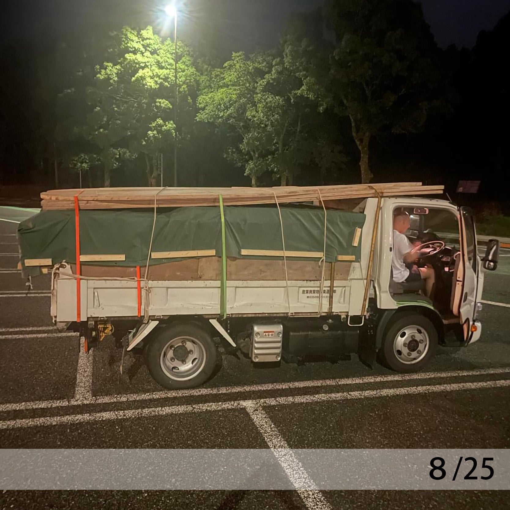 大仏部材をとりに山口「洞春寺」からスタートした2tトラックは、京都舞鶴からフェリーに乗って北海道小樽へ。トラックには前田さん、ニイさん(木こり)、ブンちゃん(僧侶)の3名が同乗。