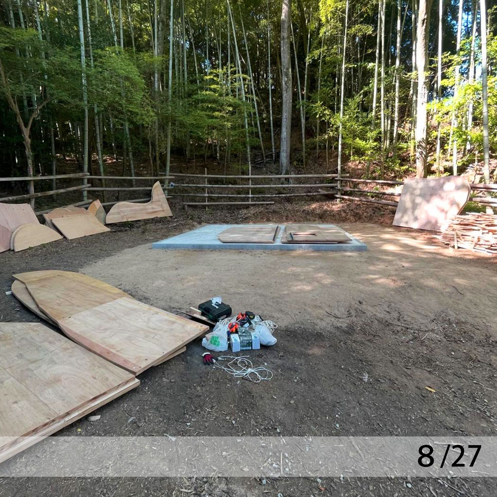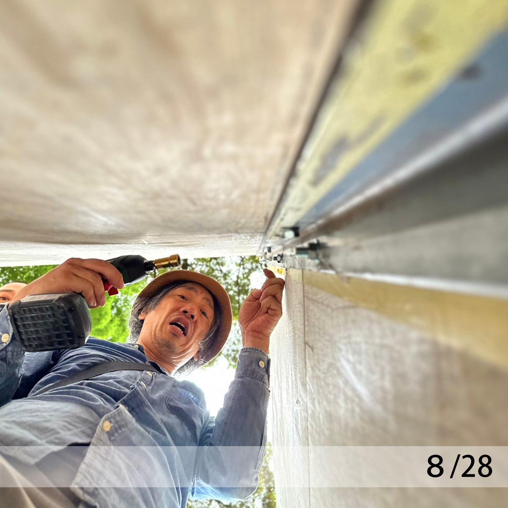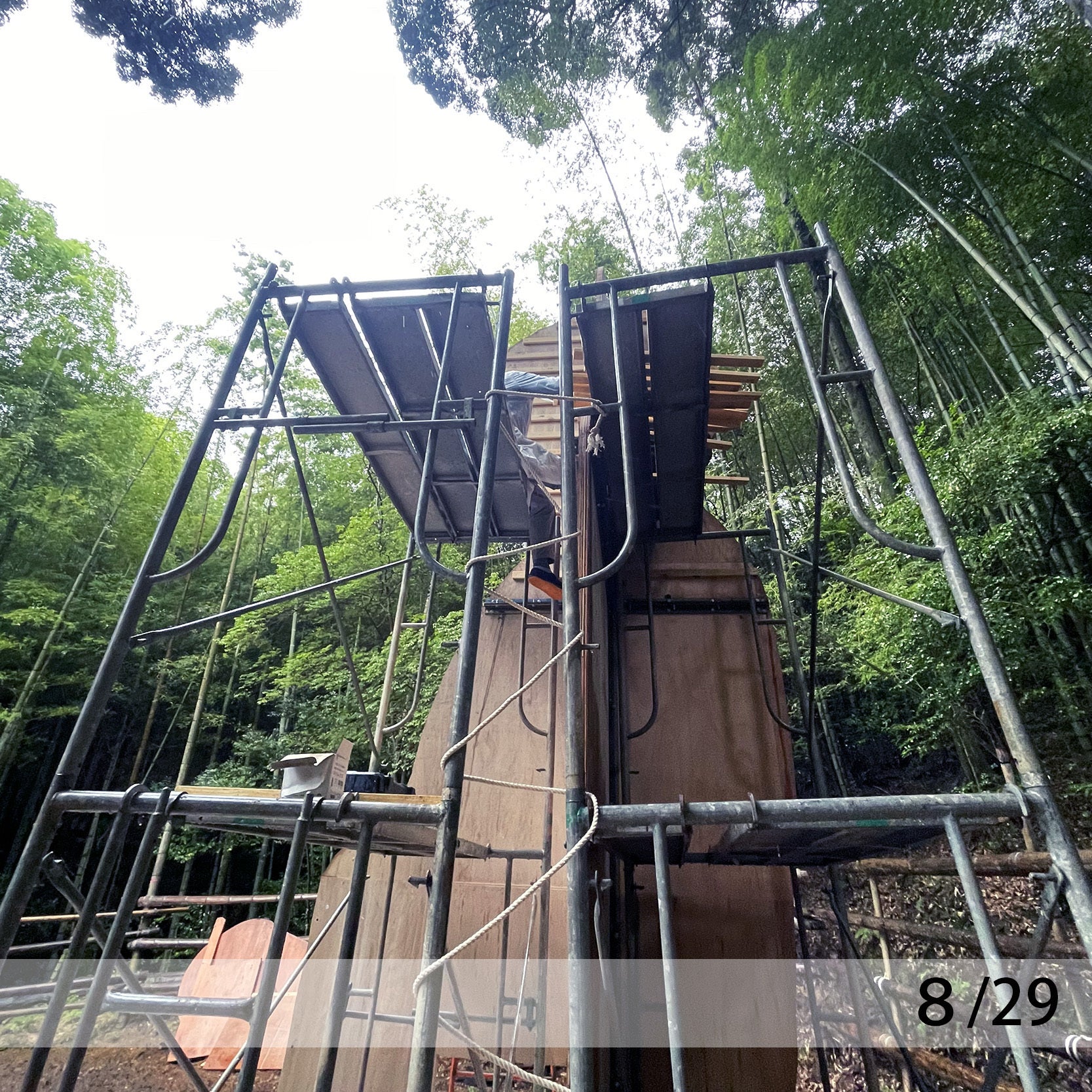 朝から雨はどんどん強くなっていき、目も開けていられない程の豪雨に。作業効率のために油性マーカーで記載していた数値も消えていくため、作業は遅々として進まない。ただ、足場を今日中に返却する予定になっているため、豪雨のなか、足場が必須な頭部棚板をとりつけるも、町中に大雨警報が鳴りひびき、作業は強制終了。