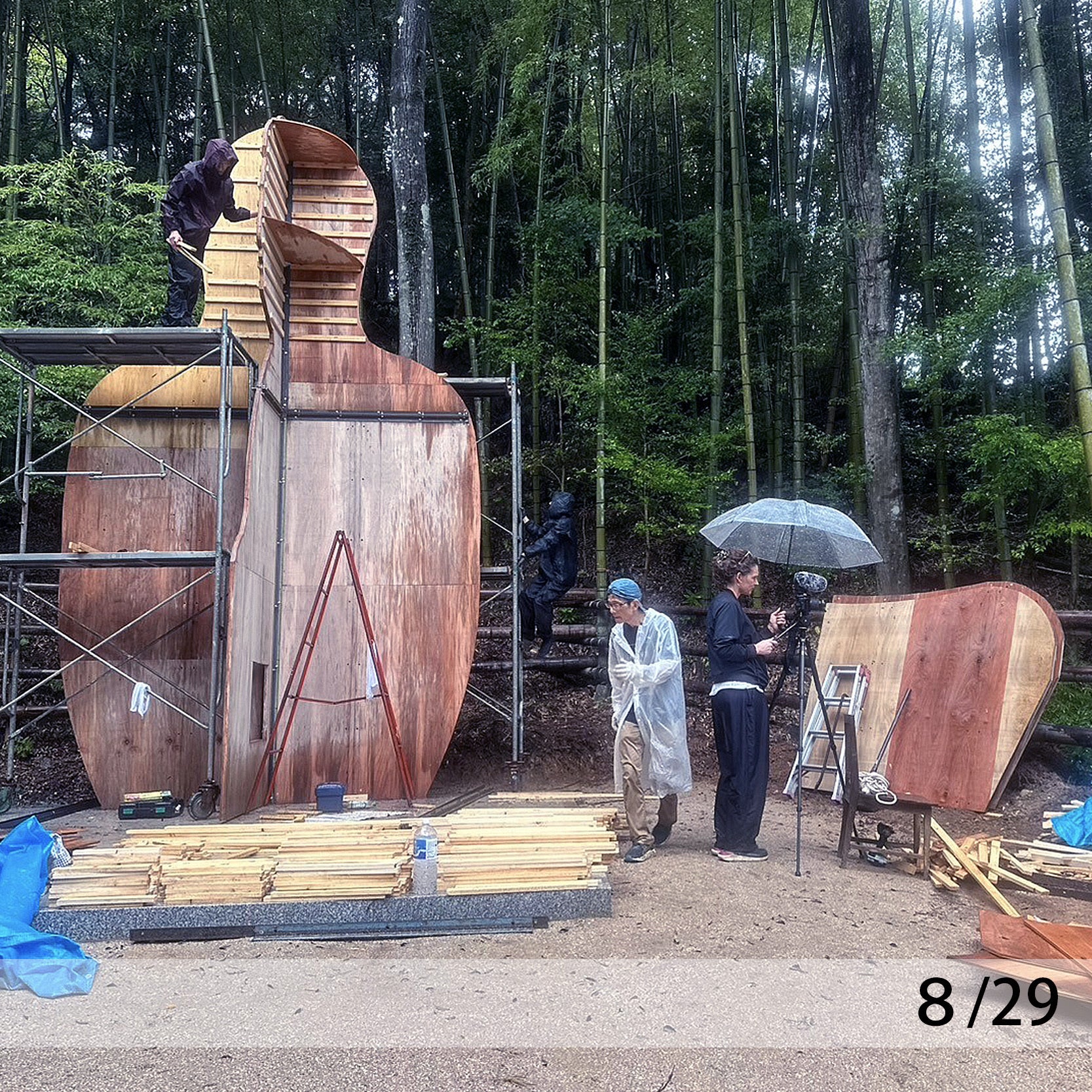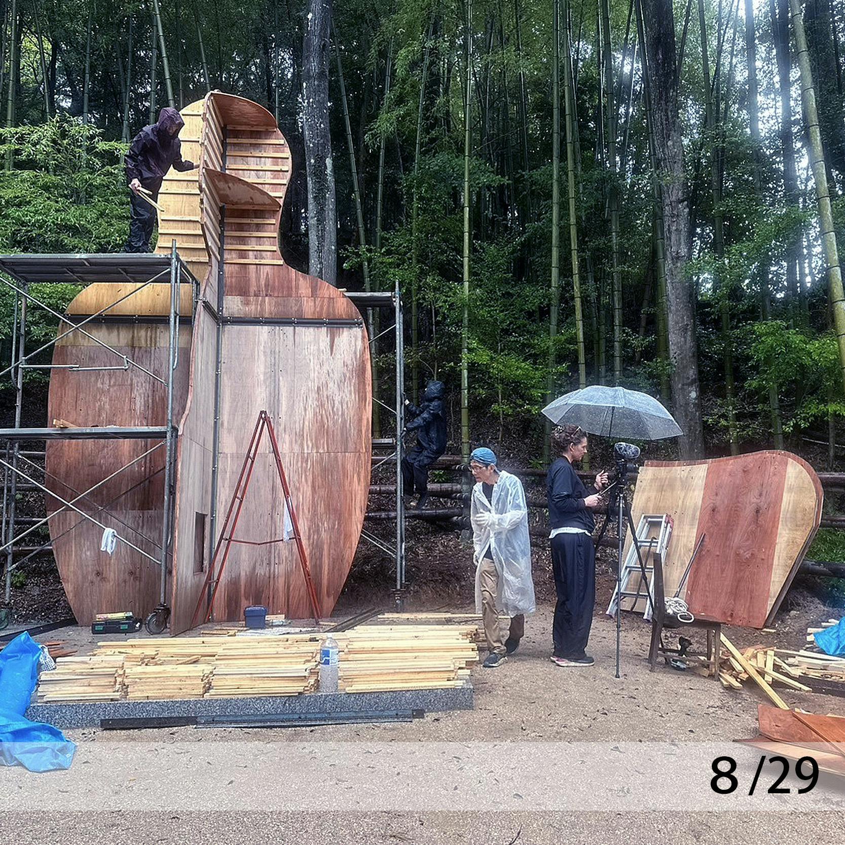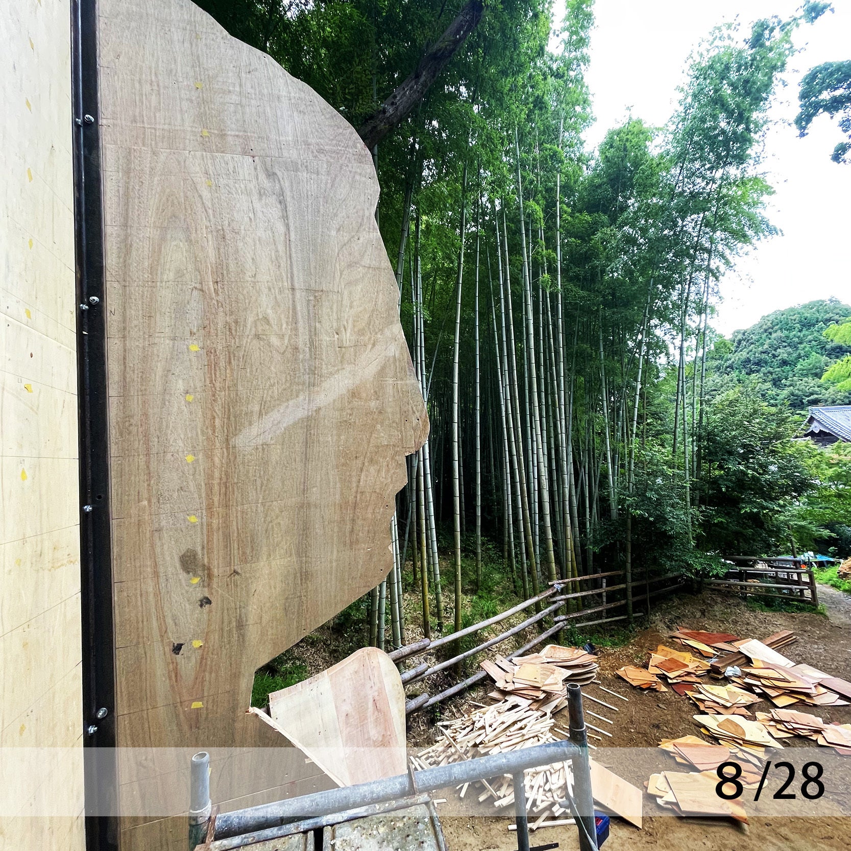 朝から大仏の大枠を立てていく。ケンさん(僧侶)、フッさん(僧侶)、ガクさん(洞春寺境内に窯をもつ陶芸家)や、洞春寺に滞在している国際ボランティアの女性らにも手伝ってもらい、一番大きな部材は立ち上がる。ここが大仏設営における最初の山場なので、少し安堵。
