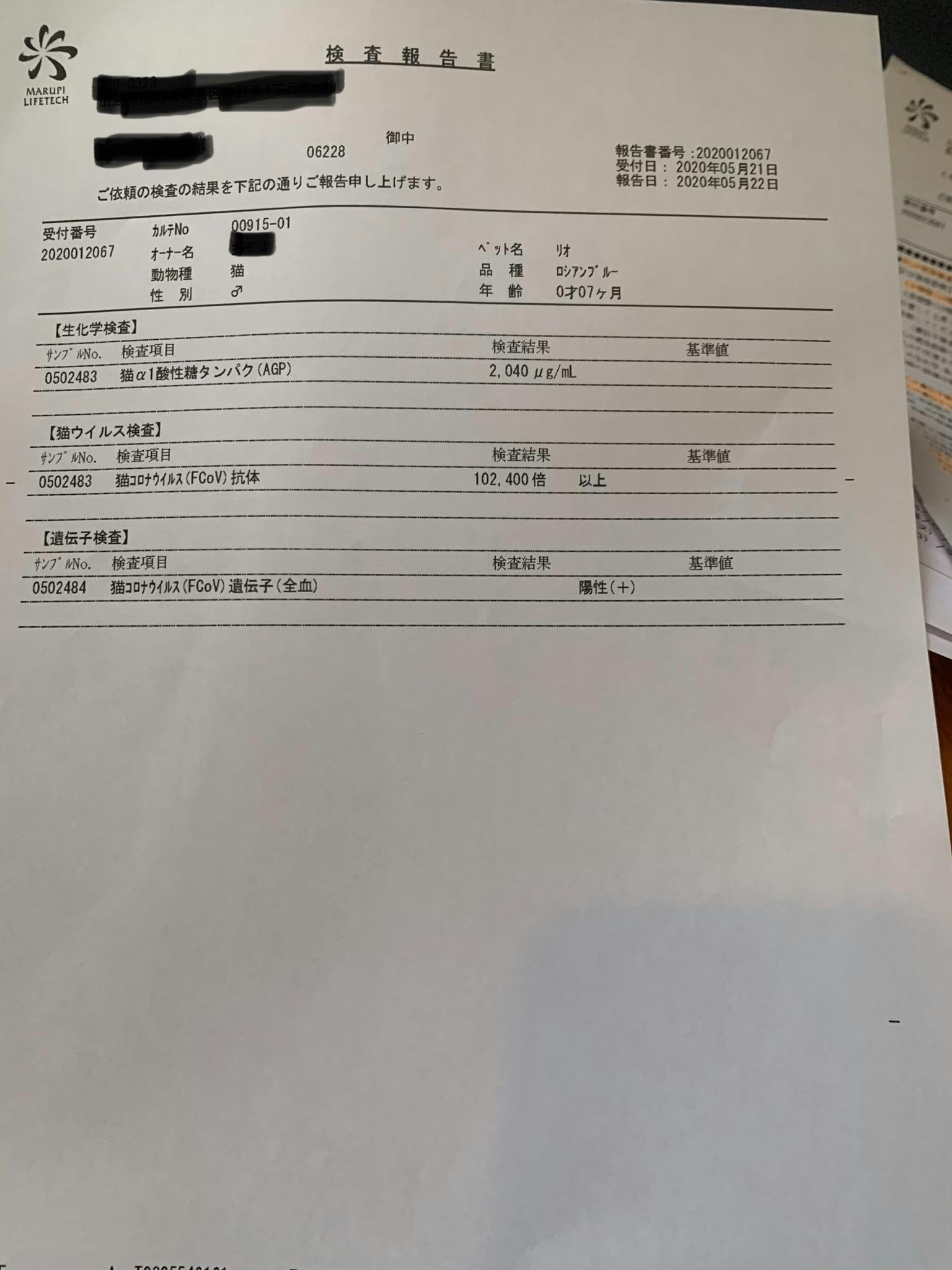 5月の19日、そのまま採血した血液を検査機関に送り、5月の23日にFIPである可能性が極めて高いと診断されました。
