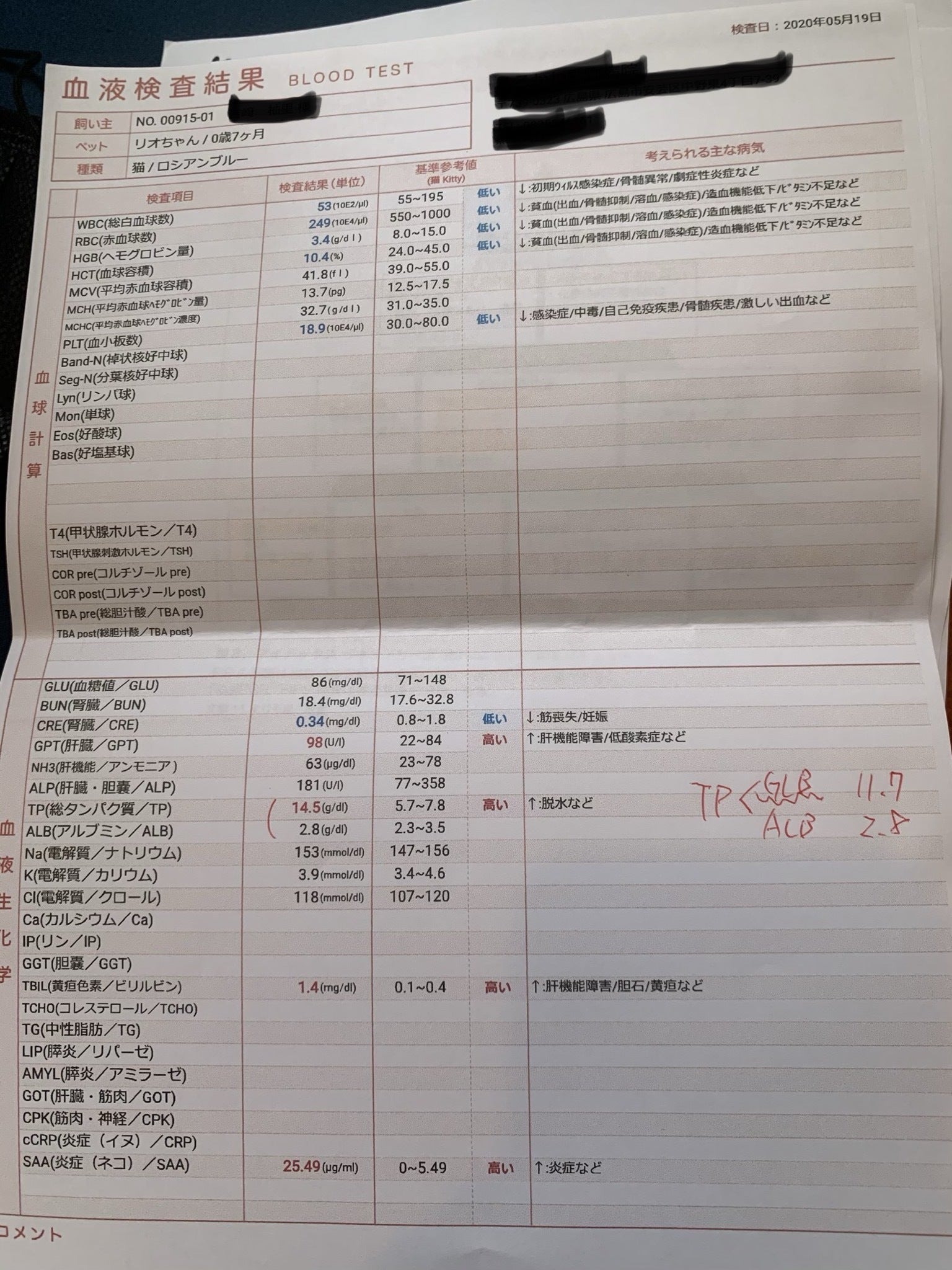 5/22 採血した血液よりFIPの可能性が決めて高いことが判明