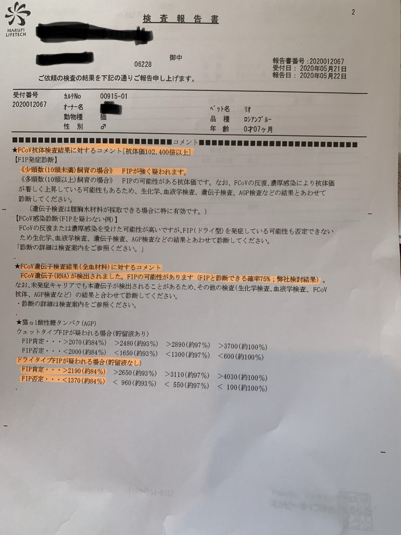 5月の19日、そのまま採血した血液を検査機関に送り、5月の23日にFIPである可能性が極めて高いと診断されました。