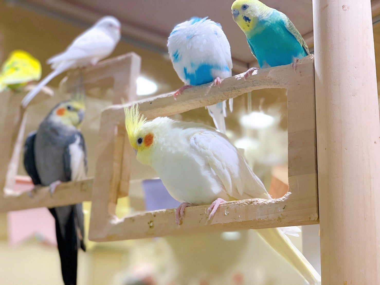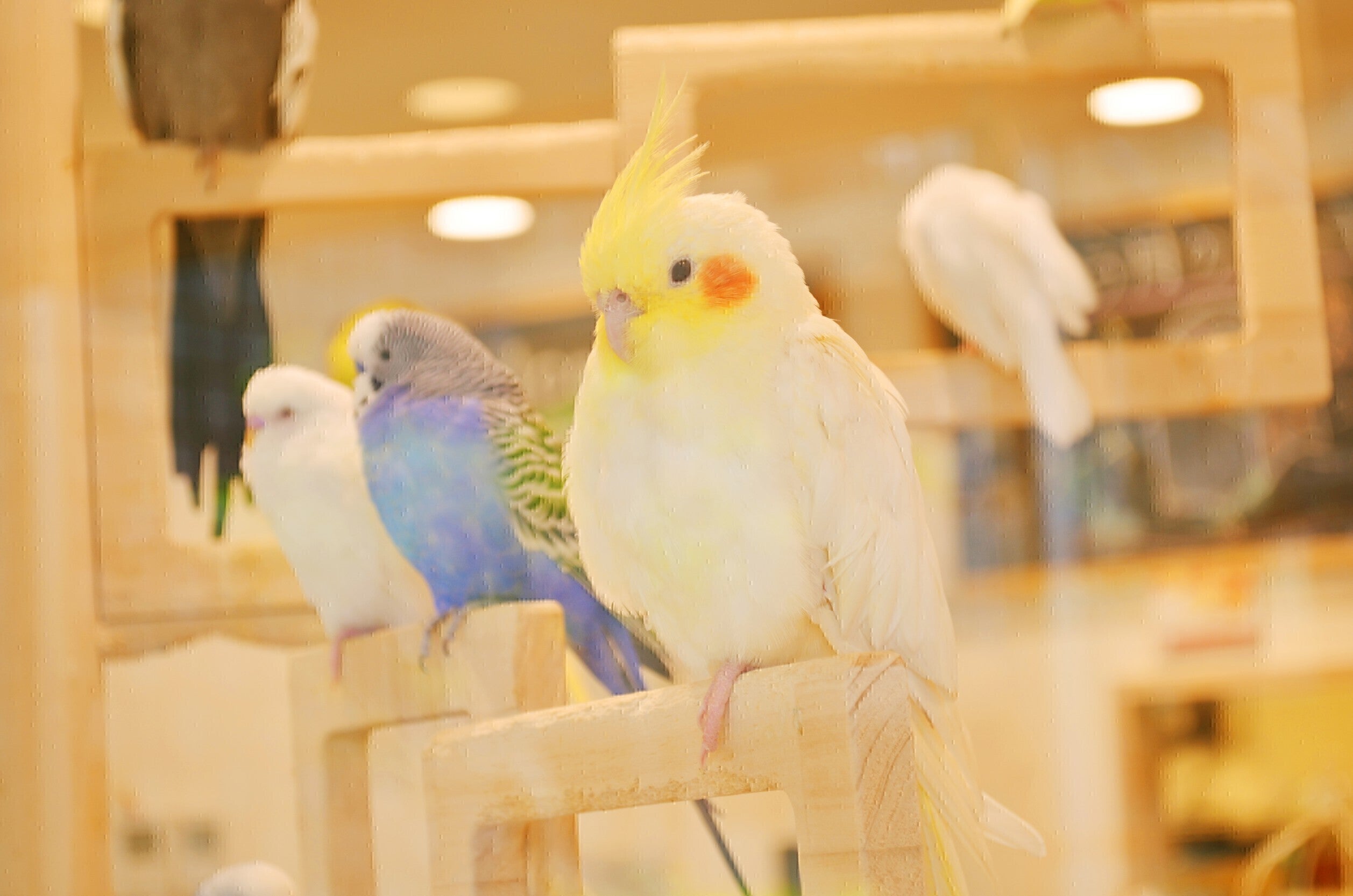 仲良く暮らすオカメインコちゃんやセキセイインコちゃんたち