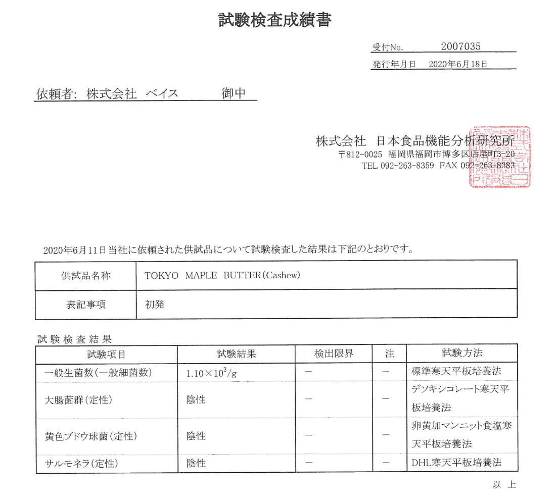 試作品を「日本食品分析研究所」に送付し、「一般生菌数」「大腸菌群」「黄色ブドウ球菌」「サルモネラ菌」の検査を依頼しておりましたが、