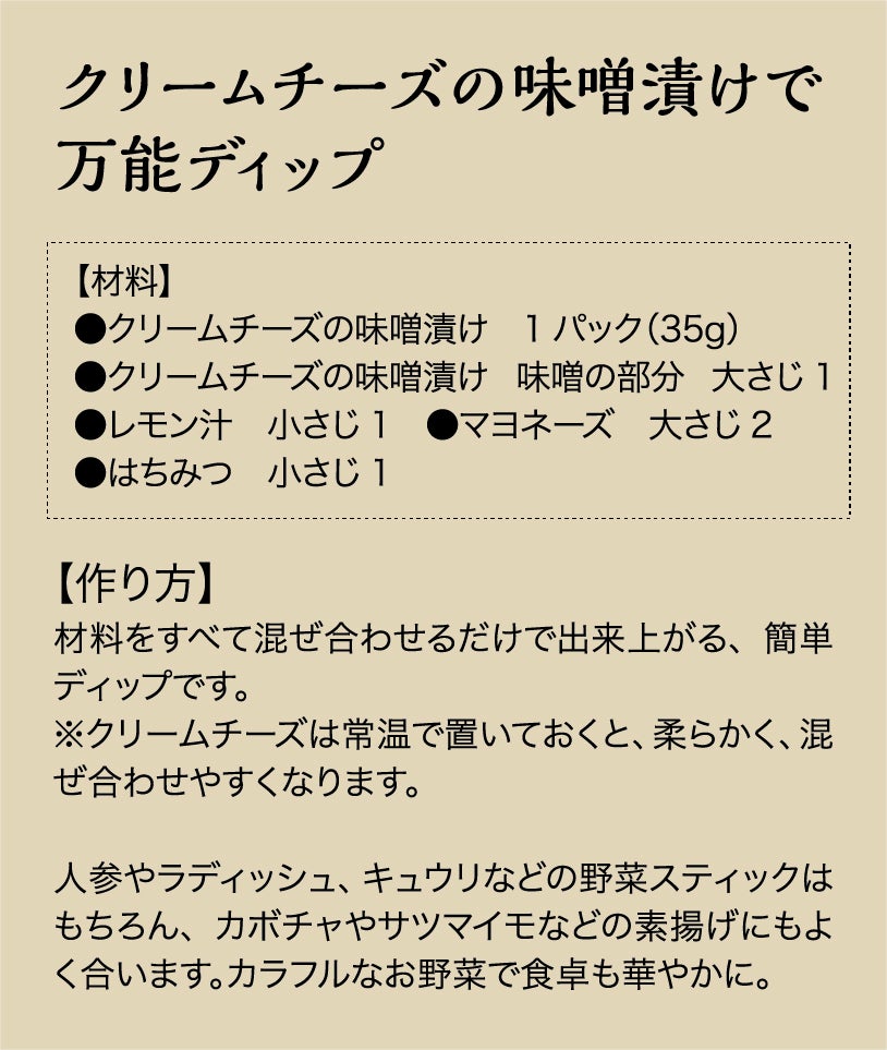 1年半以上じっくりと熟成させた逸品で熟成味噌ならではの旨みが特長の味噌にクリームチーズを漬け込みました。