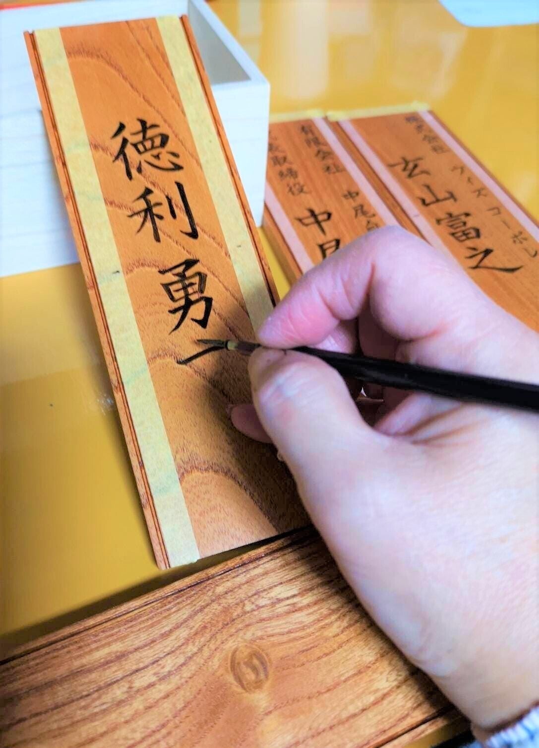 伝統工芸品である川辺仏壇の技法を使って木札を作製しています。