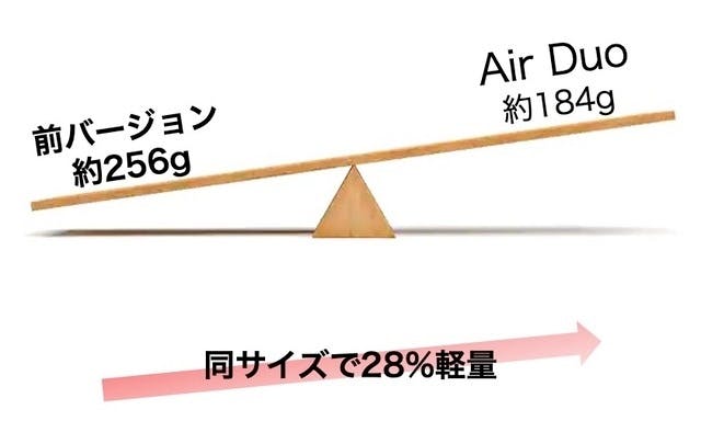 Air Duo(エアー デュオ)は、わずか184g(Lサイズ)。同サイズで256gだった前プロダクトと比較すると、28%も軽量に仕上げました。