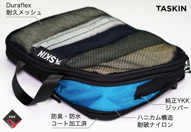 Taskin(タスキン)のすべてのギアと同様、Air Duo(エアー デュオ)は、Duraflexコーティングされた耐久メッシュ、高価なハニカム構造のリップストップ(耐破れ)ナイロン、純正YKKジッパーなどの耐久性に定評のある素材で作られています。