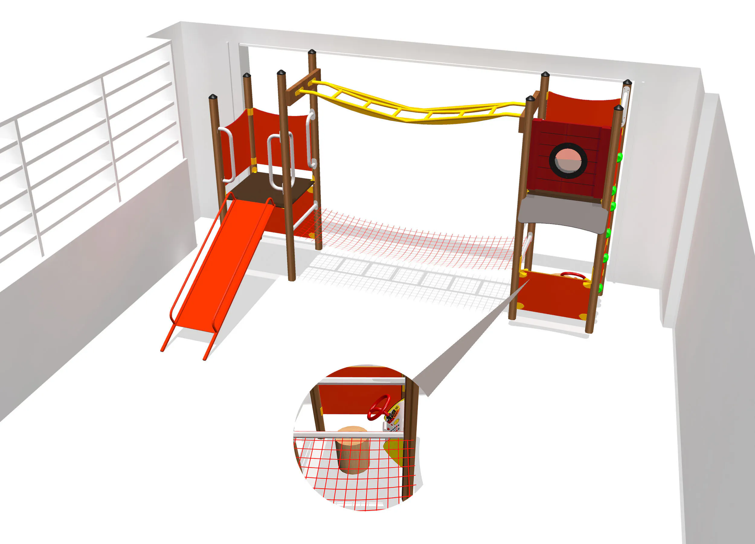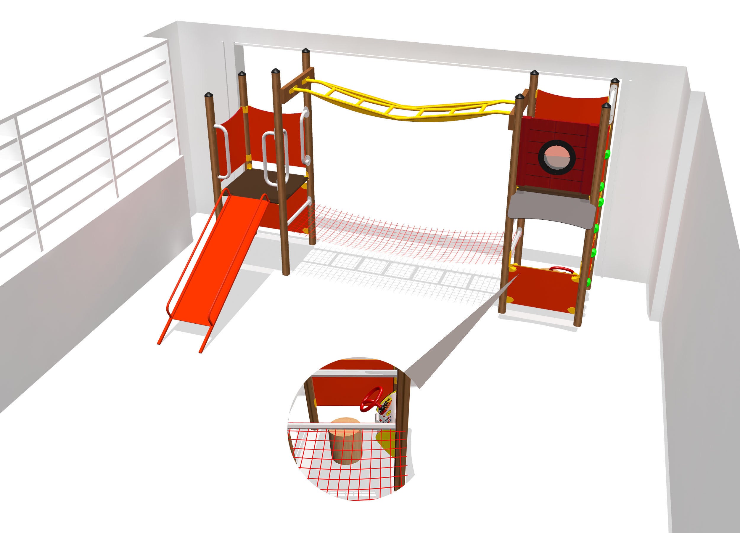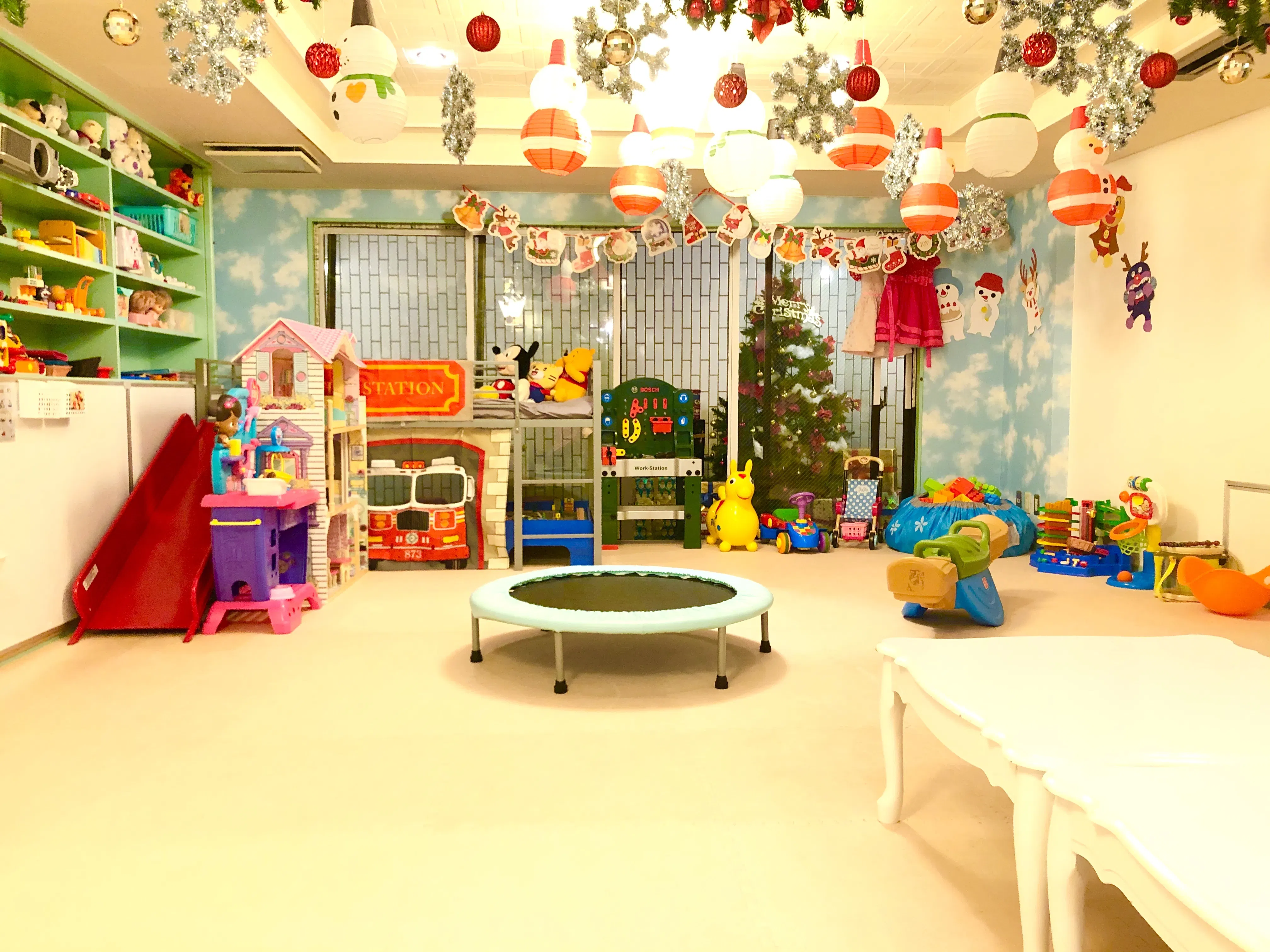 【ままごとキッチン】や【電車】のおもちゃや、【滑り台】に、【トランポリン】【シーソー】など、室内でも体を動かせるおもちゃも用意。