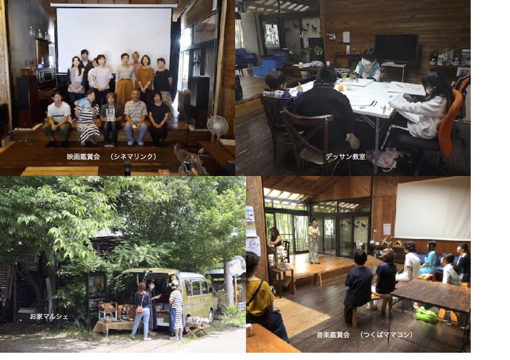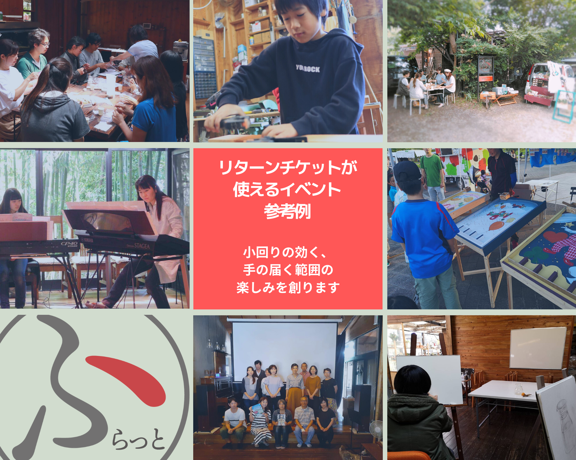 ふらっとは 、色々な分野で活動されている(又は活動したい)方々と活動する方法として、今まで、野外の大規模なコンサート、屋内音楽コンサート、ママのためのコンサート、自主制作映画観賞会、屋外マルシェ、木工教室、語学教室、IT教室、絵画教室、等多種にわたる分野のイベントを企画・運営してきました。