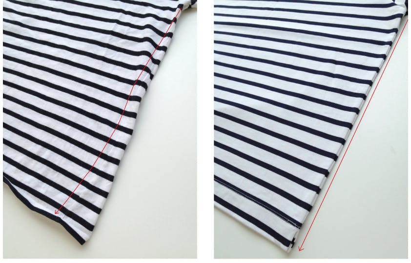 〈洗濯により斜行している製品〉 〈洗濯後の上品クロスネックシャツ〉