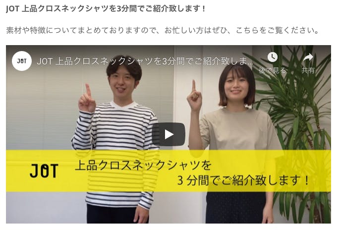 2020/07/04 10:30JOT 上品クロスネックシャツ 紹介動画をUP致しました!初めての撮影で2人とも緊張しておりますが、3分間で商品の素材や特徴をまとめておりますので、ぜひご視聴ください!CAMPFIREプロジェクトページとYoutubeにて公開しております。引き続きより多くの方々に【上品クロスネックシャツ】をお届けできるよう、スタッフ一同頑張りますのでSNSなどでの拡散にご協力頂けますと幸いです。皆さまの応援をどうぞ宜しくお願い致します。 もっと見る