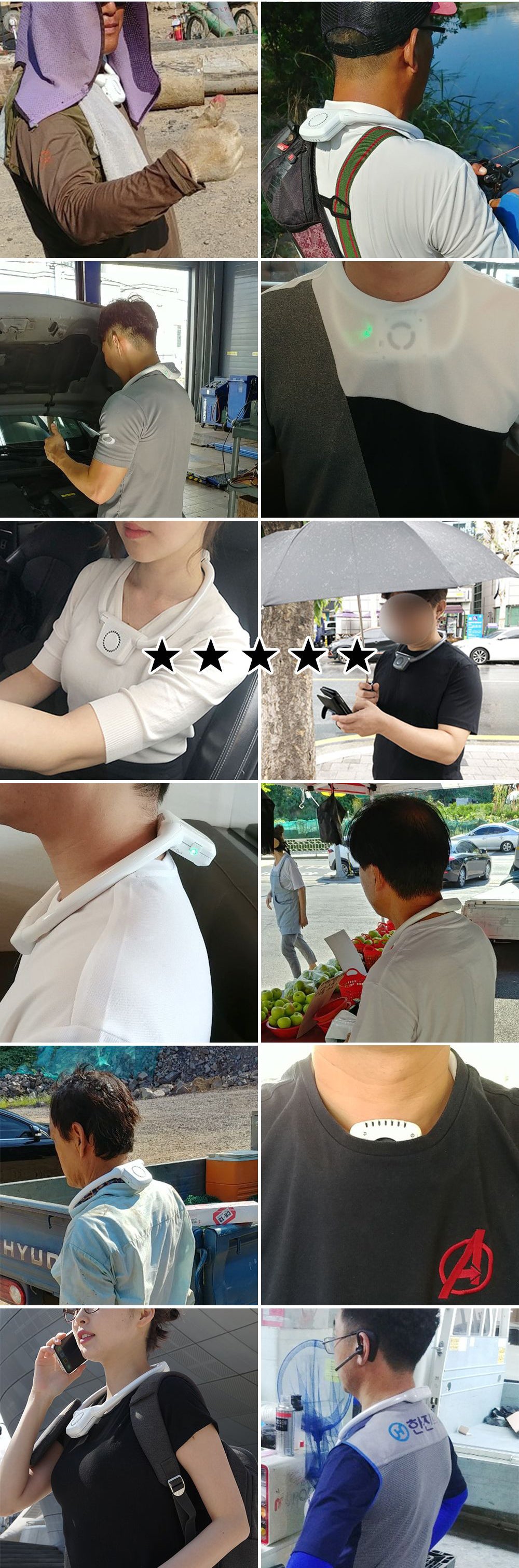 そこで考えました。 常に手で持って使う扇風機ではなく、"肌に密着して使う携帯用扇風機"が良いではないか。オール7は、身体温度の変化が激しい首を利用して、顔、首の後ろ、腹など密着した状態で風を吹き出すため、より涼しいです。