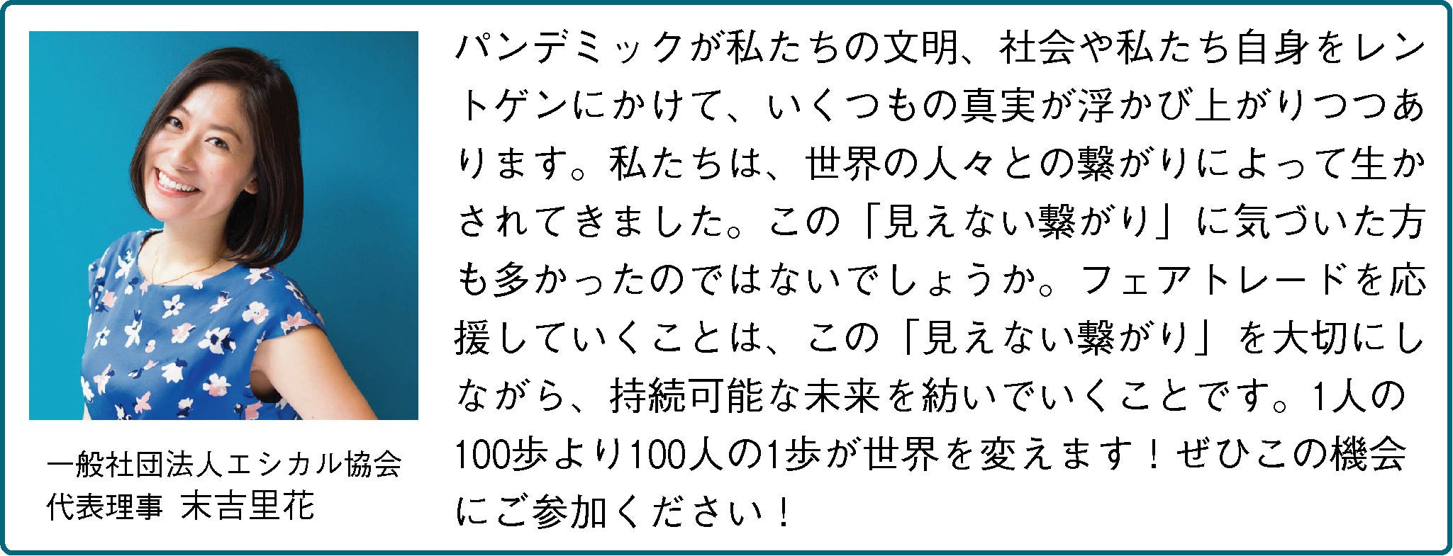 一般社団法人エシカル協会代表理事の末吉里花さんより応援メッセージをいただきました!エシカルコンシェルジュ講座を主催し、「はじめてのエシカル」「祈る子供たち」「じゅんびはいいかい?」「名もなきこざるとエシカルな冒険」の著者でもいらっしゃいます。 心強いメッセージ、ありがとうございます!
