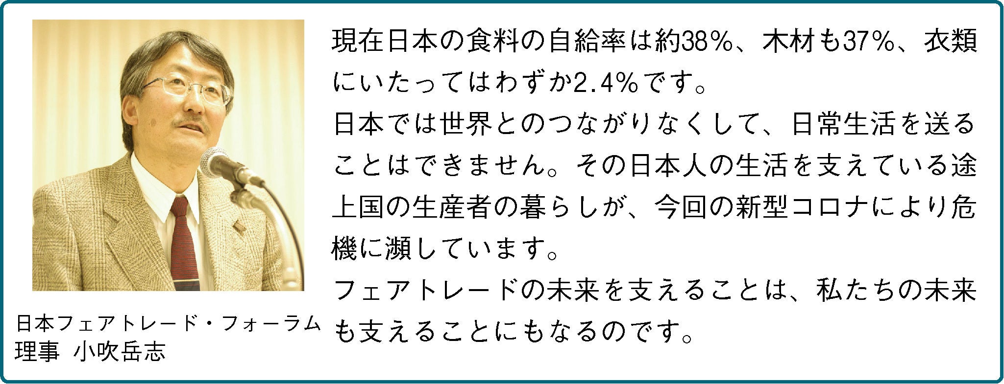 日本フェアトレード・フォーラム理事 小吹岳志さんより応援メッセージをいただきました!関西を拠点にしたフェアトレード運動の一人者。「企業のエシカル通信簿」にも携わっていらっしゃいます。 心強いメッセージ、ありがとうございます!