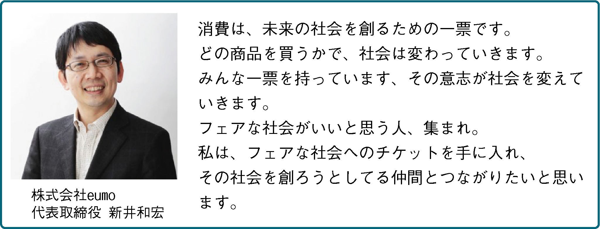 株式会社eumo 代表取締役 新井和宏さんより応援メッセージをいただきました!新井さんは鎌倉投信の創業者。共感通貨eumoを立ち上げて、これからのお金の使い方をデザインしておられます。 心強いメッセージ、ありがとうございます!