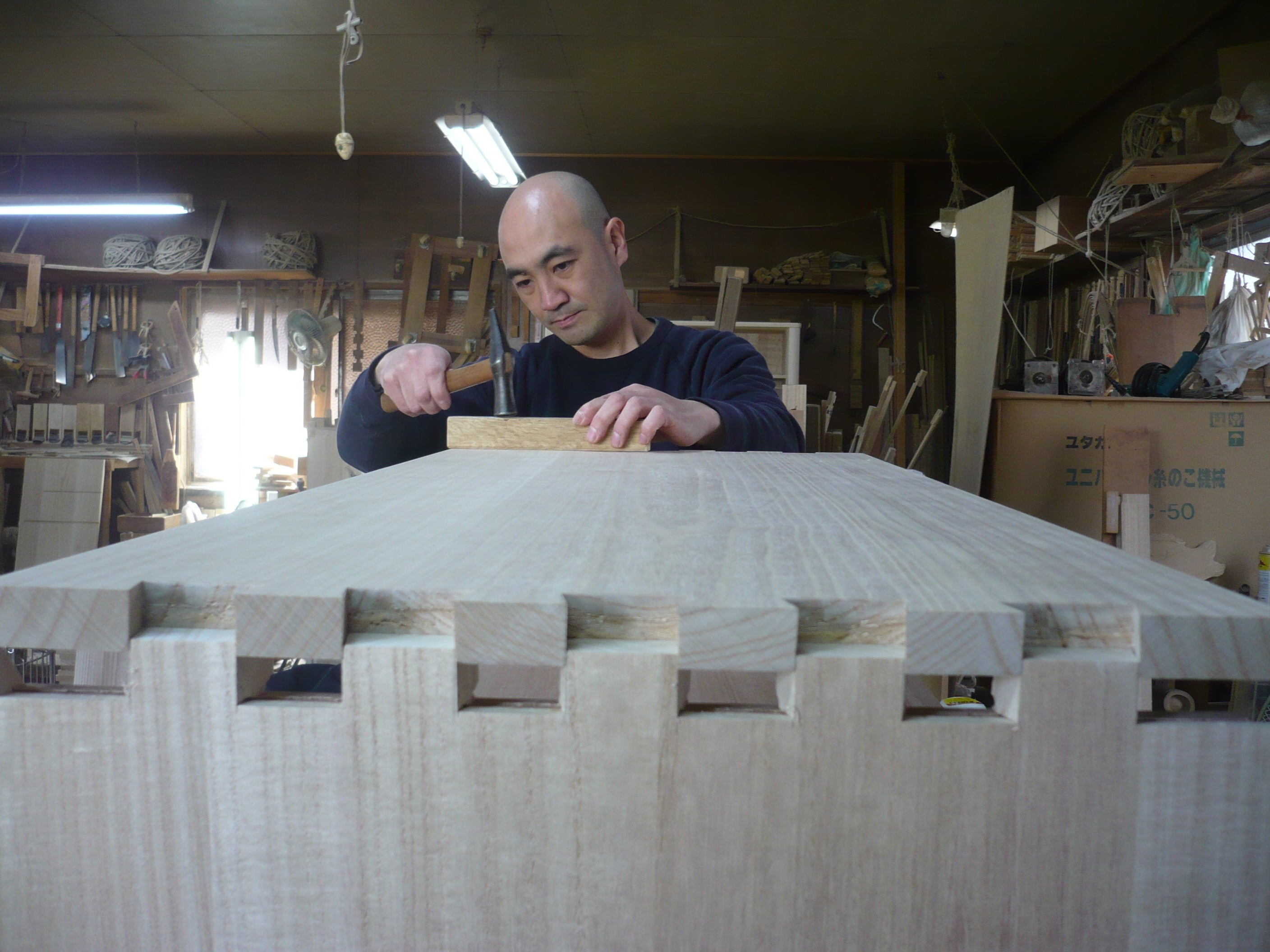 組み合わせる板同士に細かく切り込みを入れ、それを咬み合わせて組む「包み蟻組接(つつみありくみつぎ)」をはじめ、各種の組接ぎ技法を駆使して組み上げた箪笥は、丈夫で何十年何百年使っても歪むことはありません。