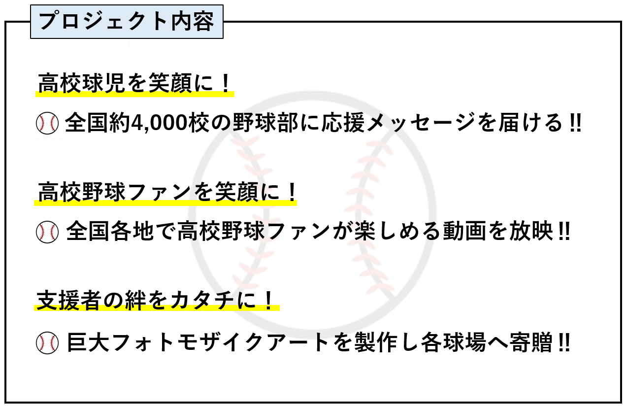 この度、元高校球児のメンバーで、『高校球児を笑顔に!』『高校野球ファンを笑顔に!』をキーワードに本プロジェクトを立ち上げました。