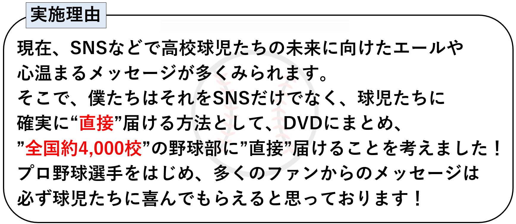 また、僕たちと同じ想いを持っている高校野球ファンやOBの皆様にご協力頂き、”直接”にこだわった形で球児たちに届けたいと考えました。
