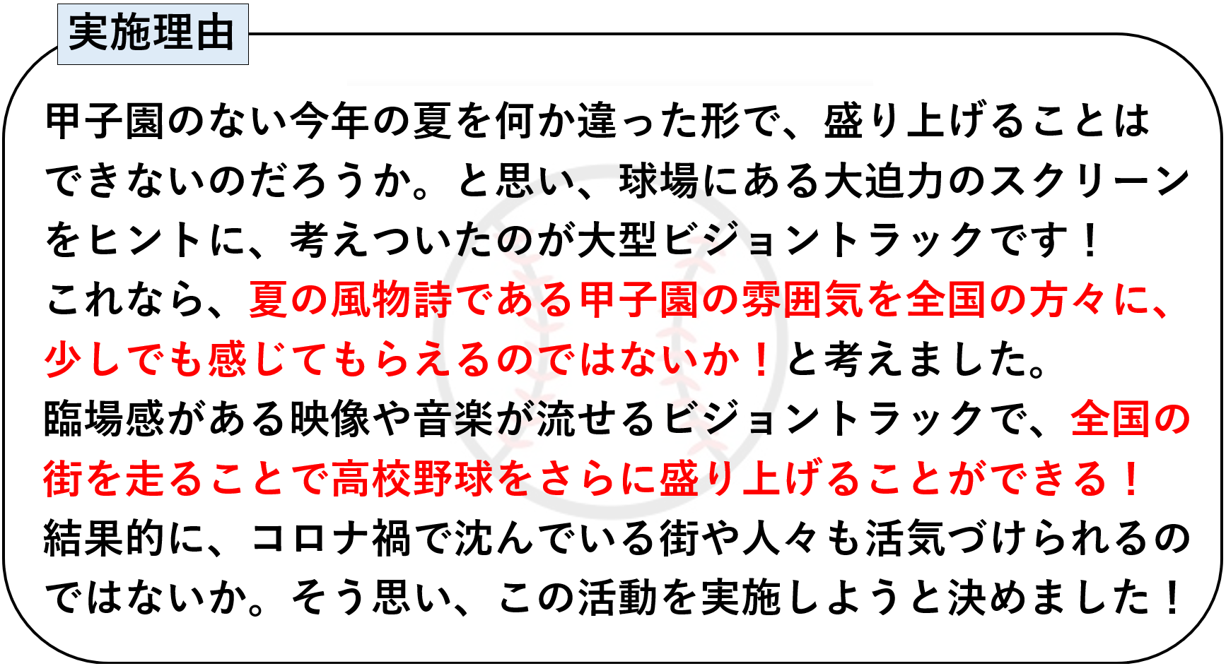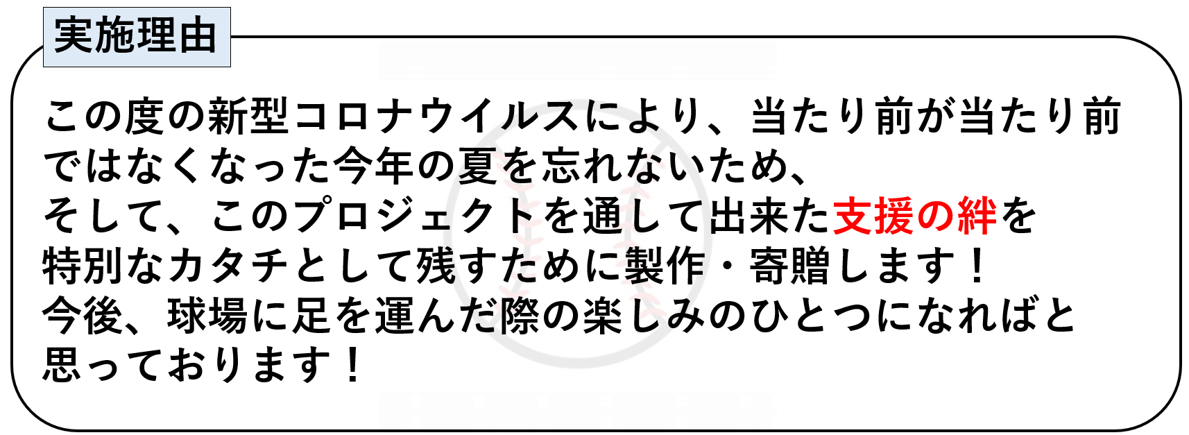 ファンの皆様と共に高校野球を盛り上げていきたい!この活動を機に、コロナ禍で沈んだ世の中を笑顔にしたい!