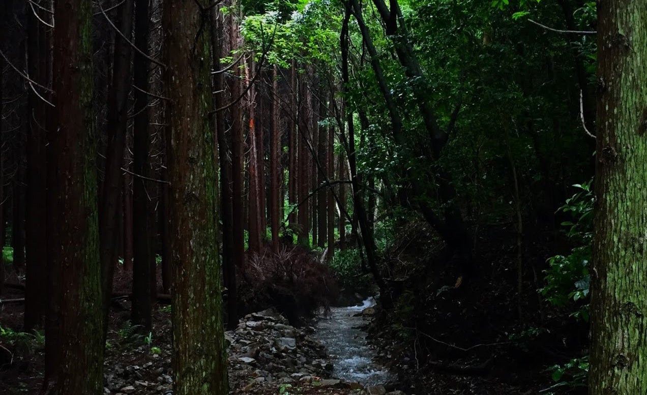 この森は長いあいだ間伐がなされなかったため昼なお暗く、いまでは足を踏み入れることもままならないほど鬱蒼としていますが、かつてここに通っていた子どもたちはこの森の中を通学し、この森で遊んでいたそうです。