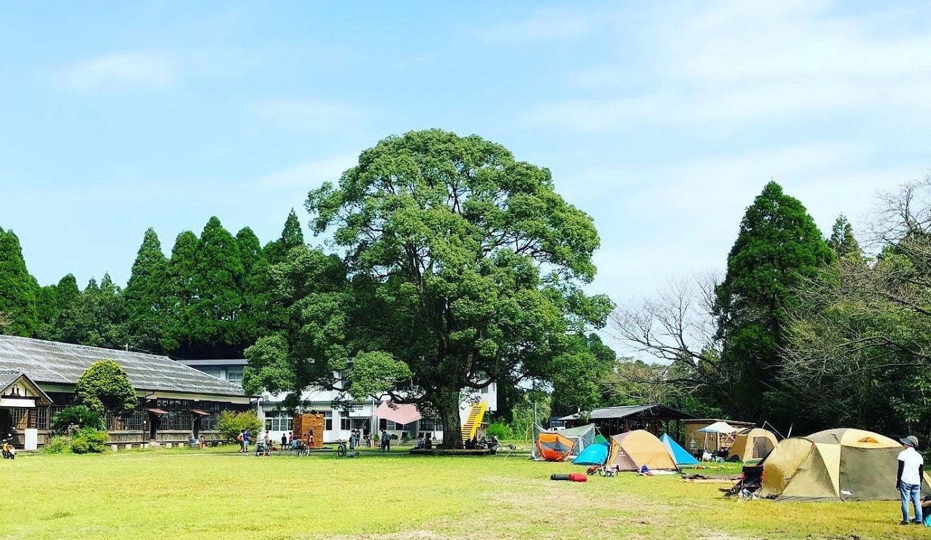 〈リバーバンク森の学校〉は、周囲を360度森に囲まれた自然環境の中に佇む旧長谷小学校を再生した複合体験施設です。この廃校の野芝で青々とした校庭には、樹齢100年に達しようとする大きなくすの木がそびえています。