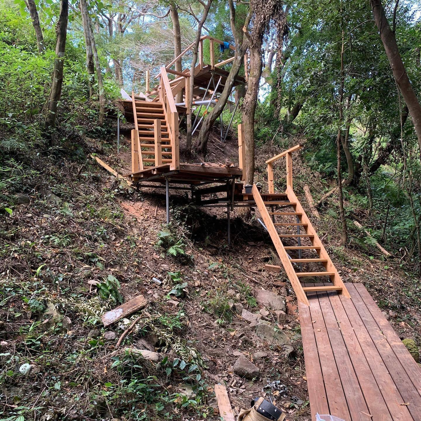 2020/10/22 09:50こんにちは!リバーバンク森の学校 管理人永山です!ついに下へと降りる階段が出来上がりました。以前の学校側からの森入り口の様子。降りられる場所がどこだかわかりませんね笑ウッドデッキから何段かに分かれて下に降りられる構造になっております。デッキの始まりは森に向かってせり出したデザインでそこから森が一望できます!そしてその先には川を渡るための橋が架けられました!以前の橋はワイルドな丸太橋でした。これなら誰でも安心して通ることができますね!橋の真ん中あたりが空いているのはそこに階段ができて皮まで降りれるようになるとのこと!完成が待ち遠しいですね!施工者でもある高橋素晴さんの記事もとても良いお話で改めてこの森が人に愛されるために頑張っていかなければと思いました。これからいよいよキャンプができるデッキへと入って行きます!また報告をさせて頂きます。リバーバンク森の学校 管理人永山 もっと見る