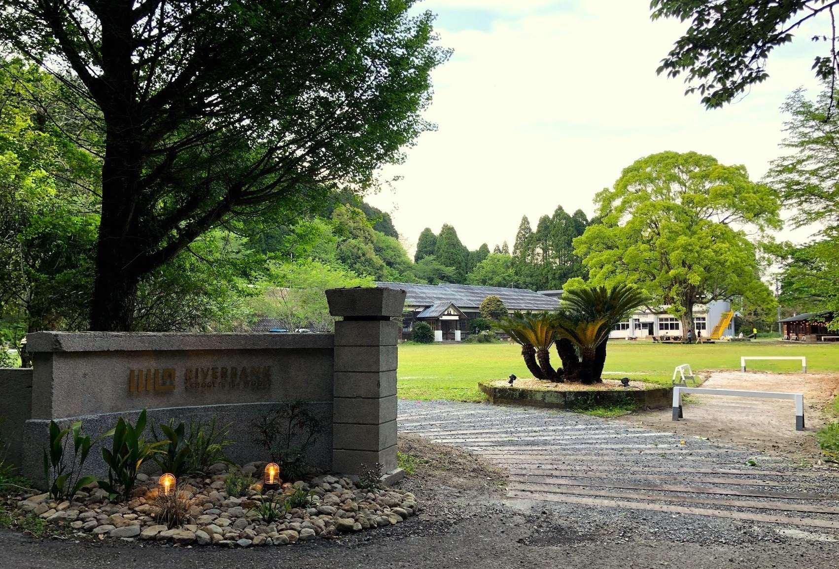 〈リバーバンク森の学校〉は、周囲を360度森に囲まれた自然環境の中に佇む旧長谷小学校を再生した複合体験施設です。この廃校の野芝で青々とした校庭には、樹齢100年に達しようとする大きなくすの木がそびえています。