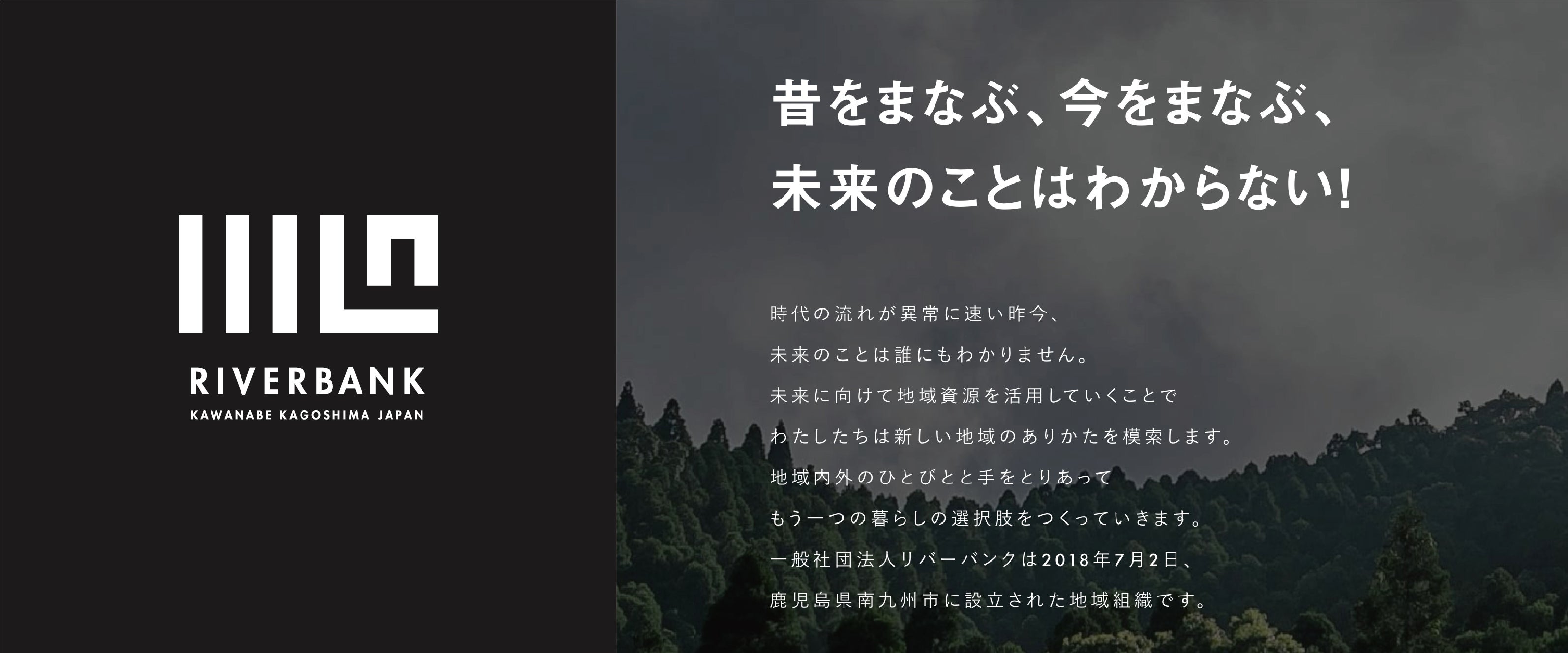 私たち一般社団法人リバーバンクは、地域資源としての廃校の再生などを通じて鹿児島の里山の原風景を残し、都市部にはない暮らしの選択肢を作るという目的で活動をしています。それは単に鹿児島のいち地域の活性化にとどまらず、次の世界をつくるすべての子どもたちに残していきたい宝ものになるという想いを持っています。
