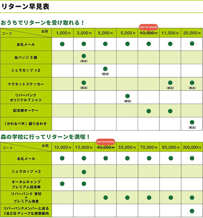 今回支援していただくにあたって、地元の生産者の方にもご協力いただき魅力的なリターンをご用意しました!〈リバーバンク森の学校〉オリジナルグッズや地元で生産されている和牛などに加え、地元の豊富な食材を堪能しながら森の学校の環境を独り占めできる貸し切り権や、再生する森に多様性を取り戻すために樹を植える権利、リバーバンクメンバーによる地域の視察案内など盛りだくさんです!