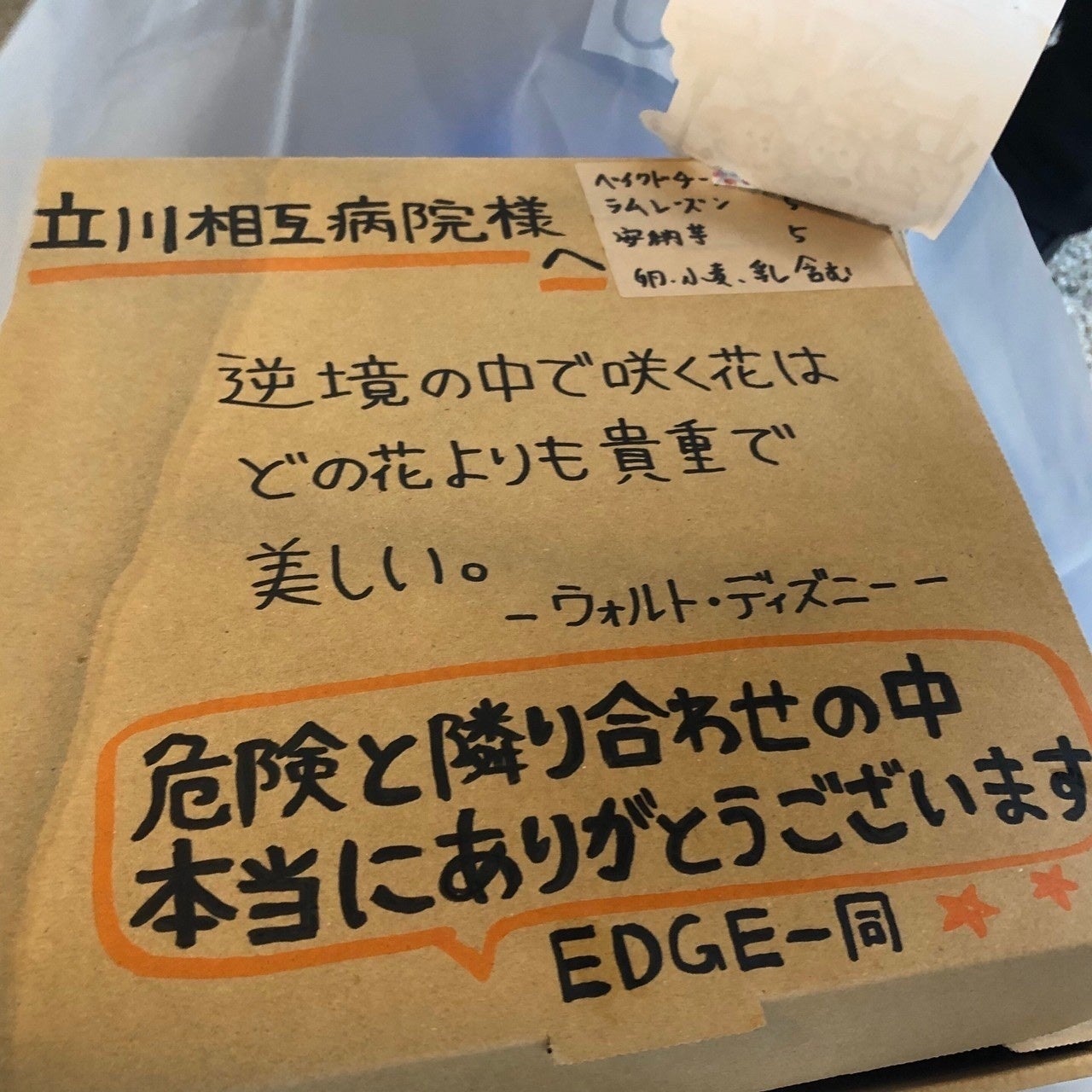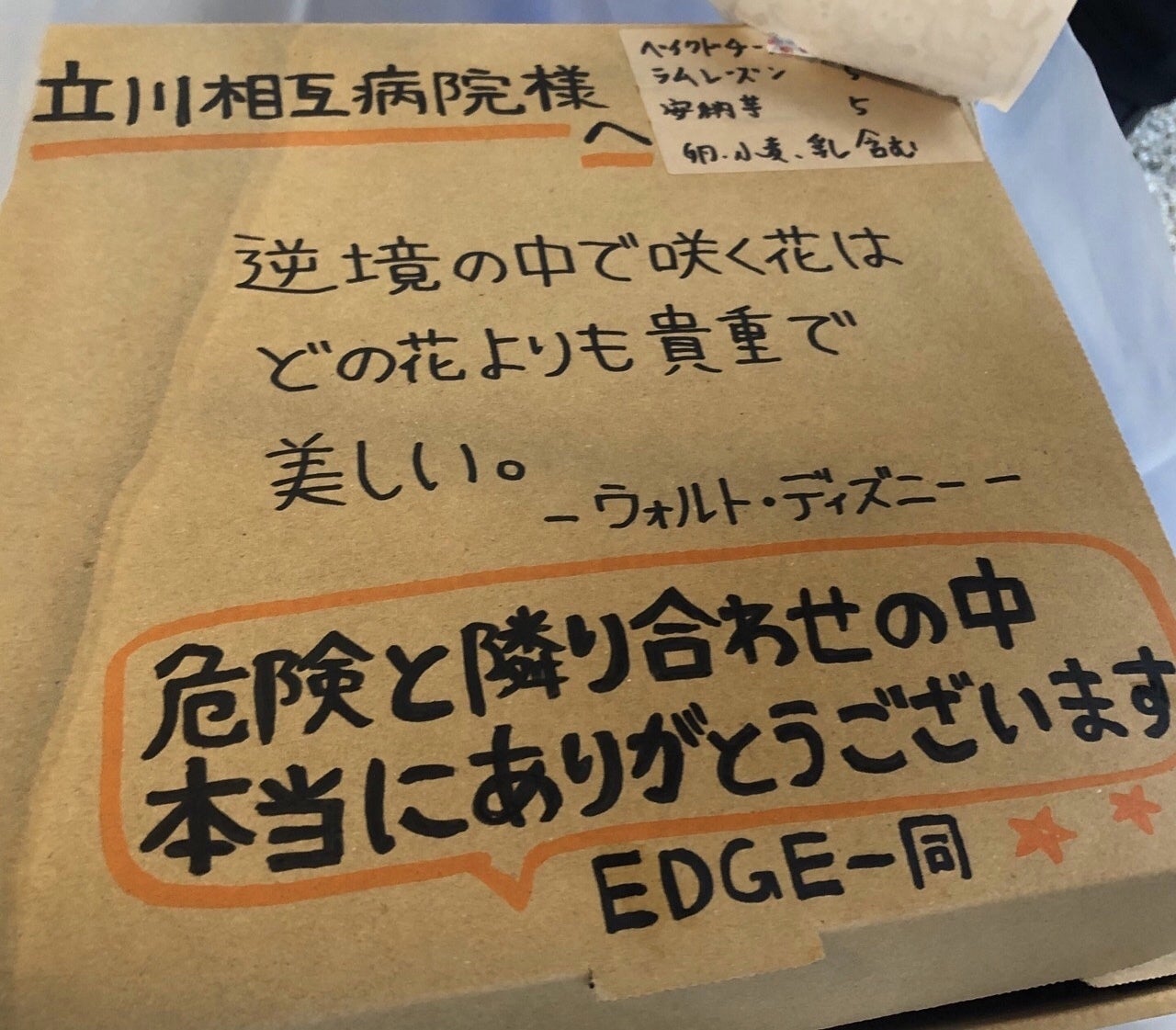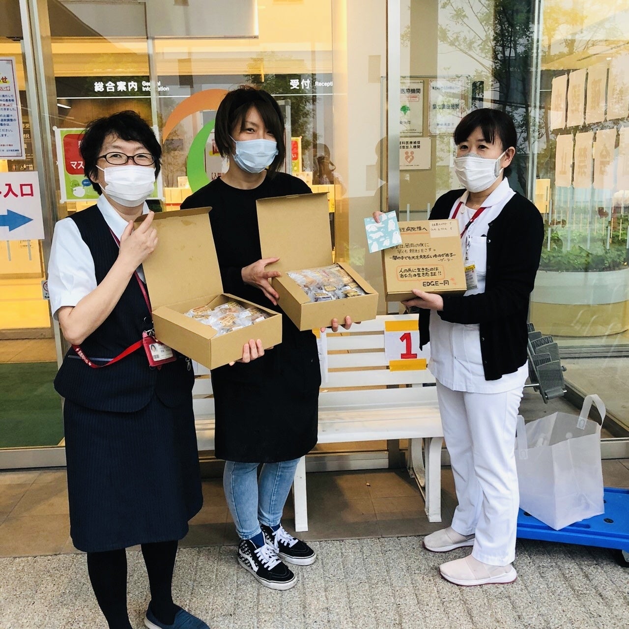 立川絆プロジェクト参加店であるCafe&Bar EDGEさんがプロジェクトのお弁当支援に先駆けて手作りケーキを立川相互病院・永井産婦人科の医療従事者の皆様へ無償でお届け。