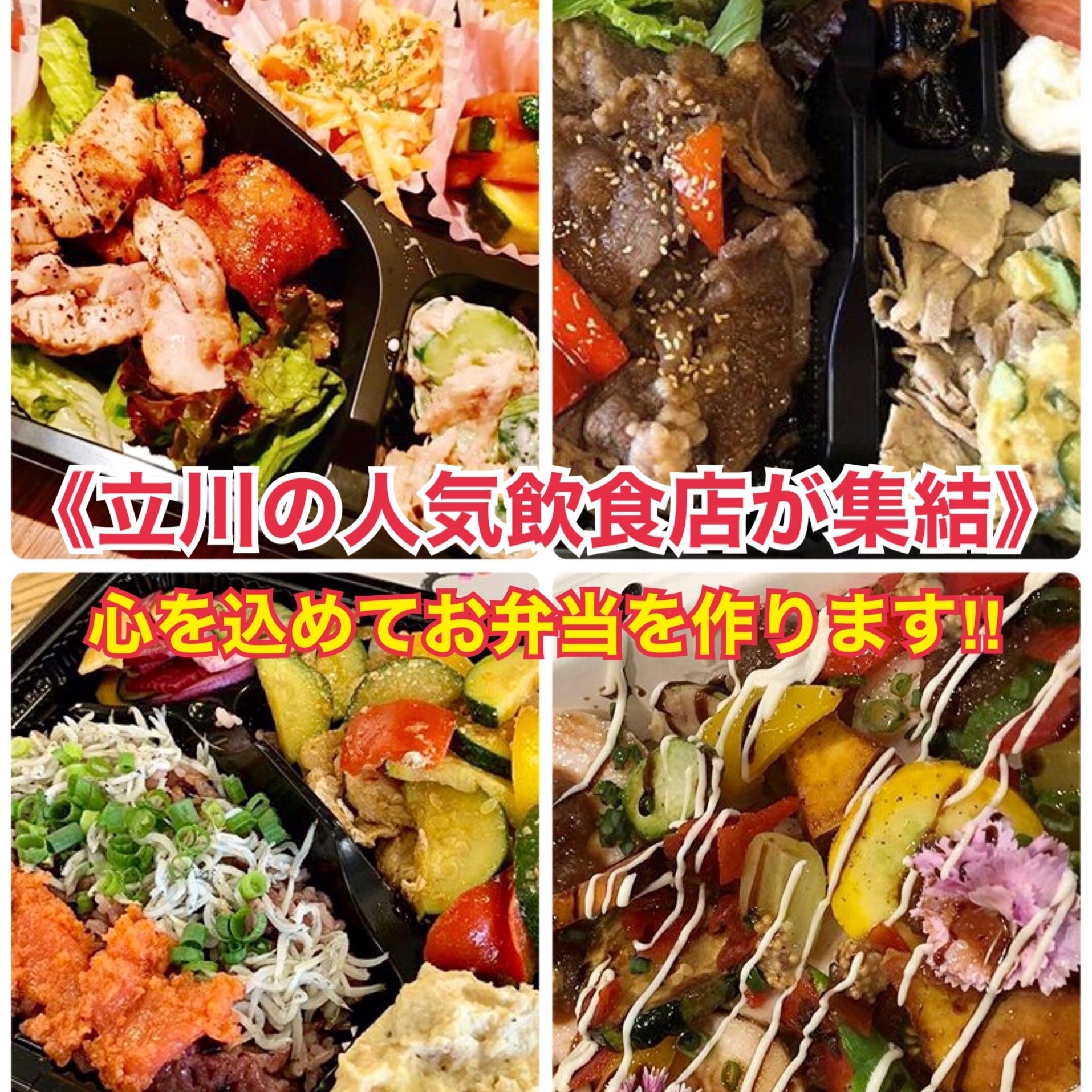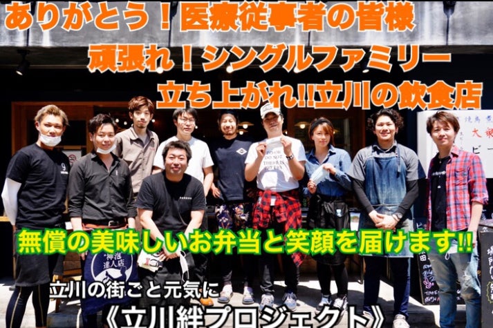 立川相互病院さんを始めとする医療従事者の皆様とシングル家庭の皆様へ応援メッセージと無償お弁当をお届けします。皆様からのご支援頂き、地域の生産者さんから食材を購入し、地域の飲食店が心を込めてお弁当を作りお届けする事で皆様を笑顔にします!
