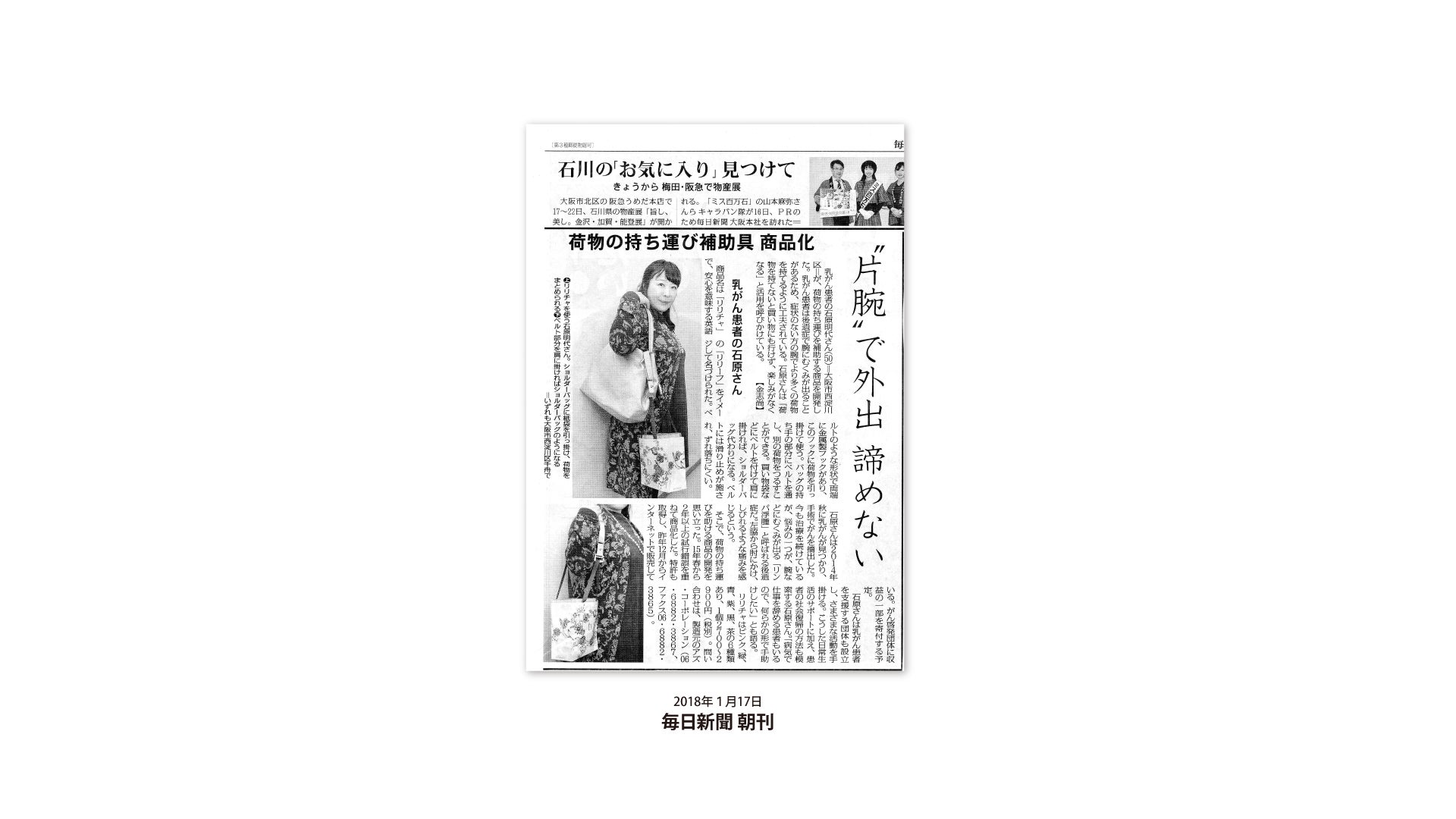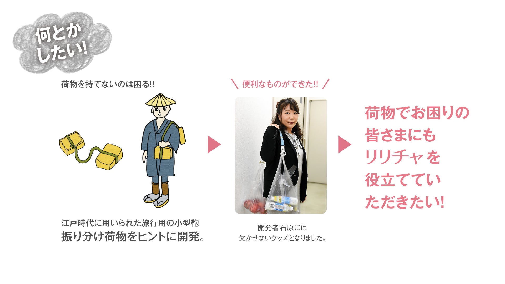 でも片方の肩や腕で今まで通りの荷物を持ちたい。そんな気持ちで、作ったのが「リリチャ」です。