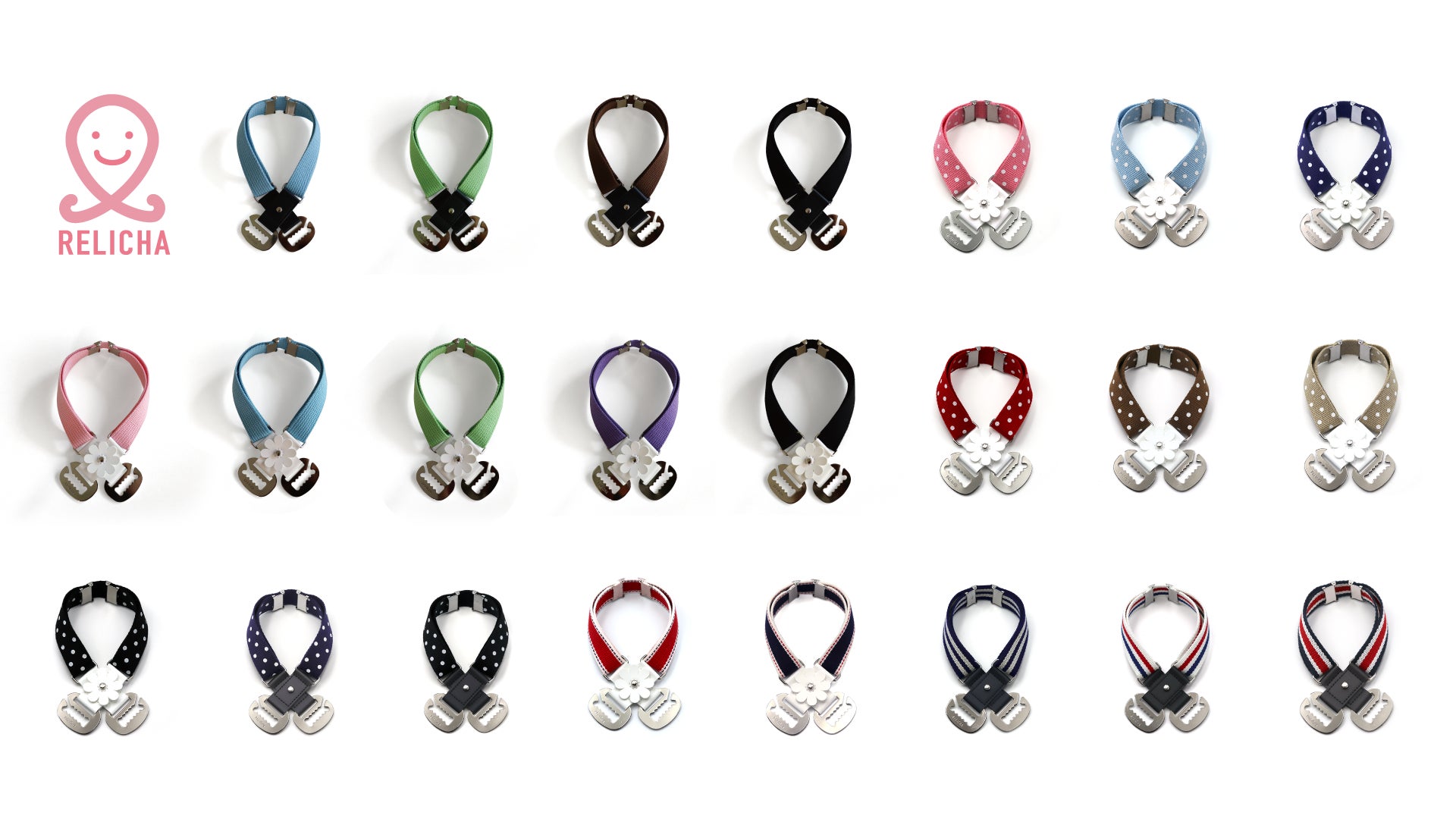 ホック止のところは、シンプルなブラックと白いフラワーの飾り付きの2種類をご用意しています。また、ベルトはいろんな色やストライプ・ドットなどの柄もあります。