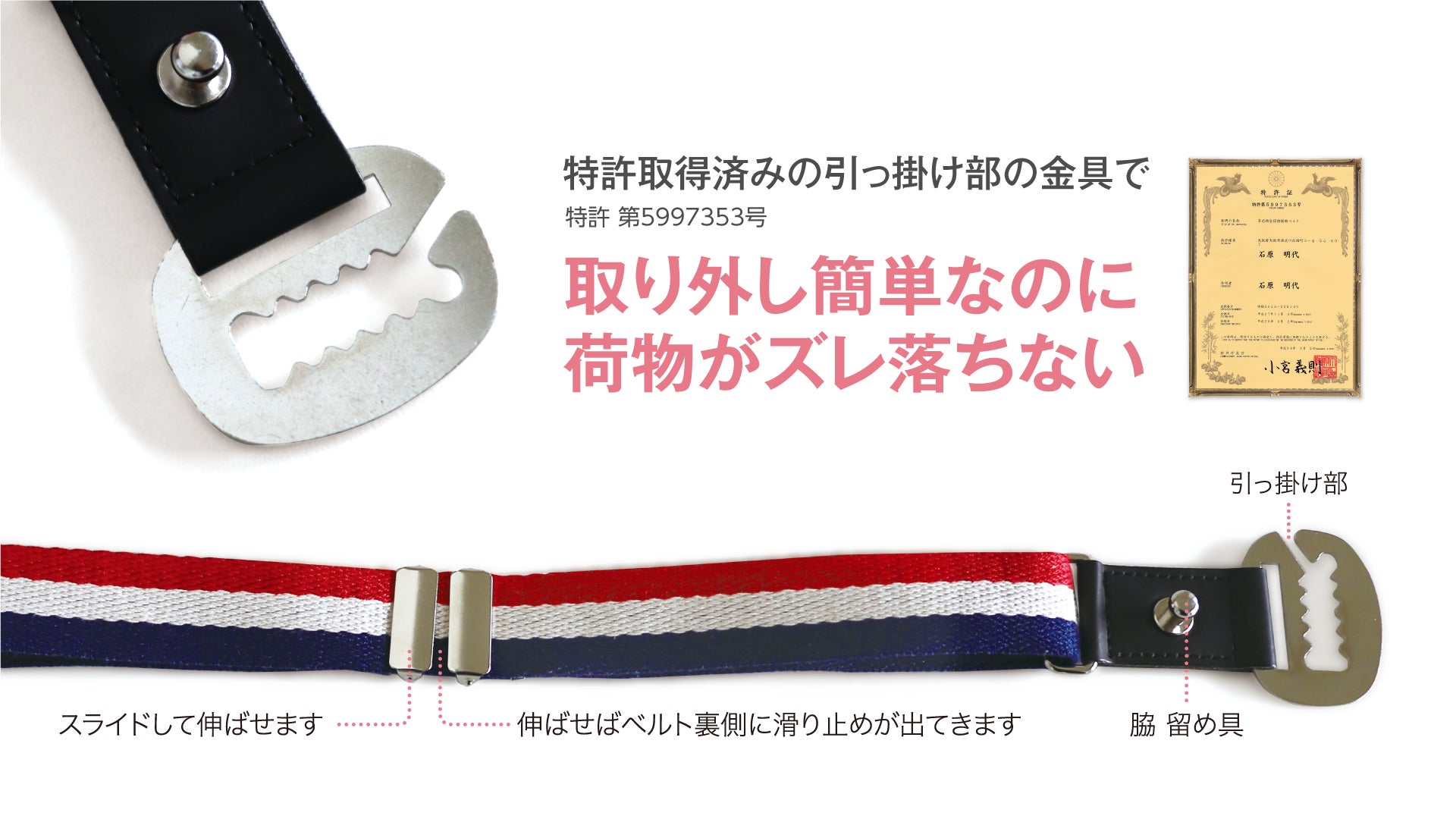 私が、乳がん手術後に重い物が持てなくなったことがきっかけで、楽にたくさんの荷物が持てるツールができないかと、この「荷物増えても安心チャーム・リリチャ」のアイデアが浮かび、試行錯誤し特許取得後に商品化しています。