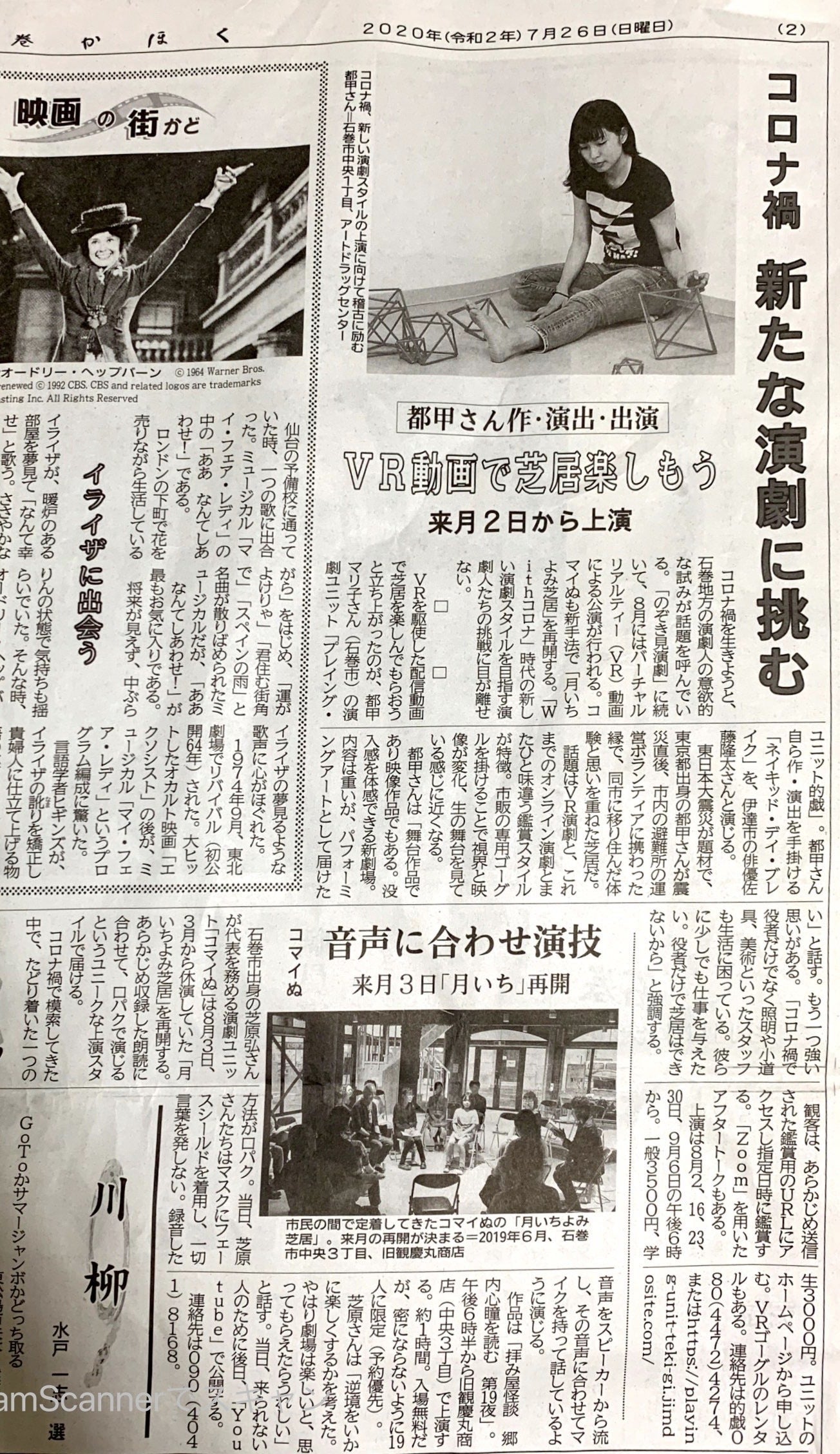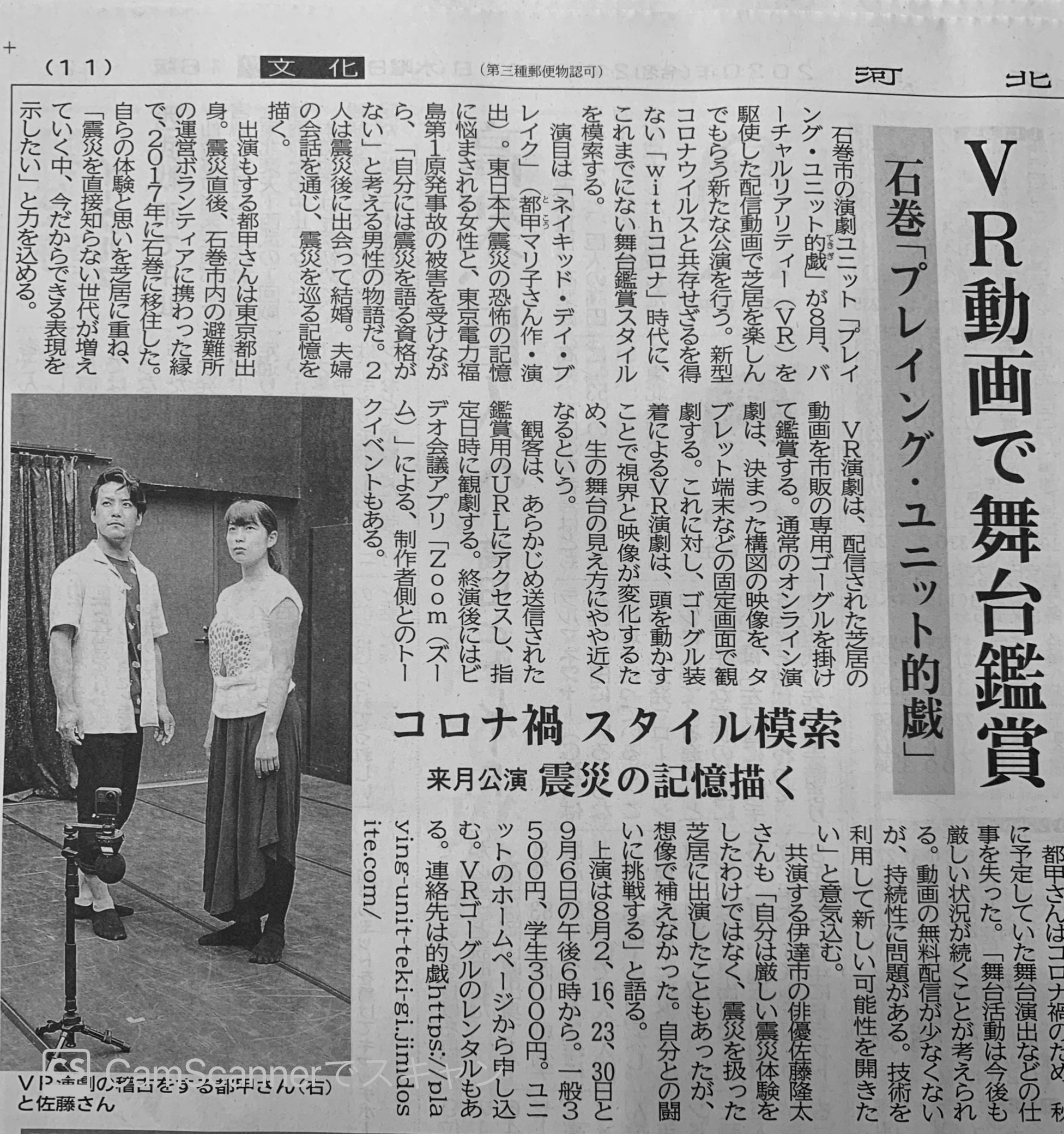 プロジェクトの公開から、一夜明け。。。ご支援いただきまして、本当にありがとうございました。「クラウドファンディングは、1日目が要」という常識は知っているのですが、正直お一人お一人にお願いするのもなかなか心情的にハードルの高い作業でして、あまりできておりません。。。そんな中でご支援いただいた皆様には、本当に感謝申し上げます!!ありがとうございます!!ええ、まだまだ目標には遠いですが、一歩ずつ進んでいきますので、皆様引きづつきご支援のほど、よろしくお願いいたしますm(_ _)mそんな中、7月17日付の河北新報社様の記事として、公演の内容を取り上げていただきました。演劇を?オンラインで?しかもVR?え、チケット代とるの???などなど、普段とは違う、慣れない用語だらけの取材をしていただき、丁寧に記事にしてくださりまして、ありがとうございました。多くの方々にこの試みを知っていただき、演劇や舞台芸術界隈の、生き残りをかけた挑戦を応援してくだされば幸いです。どうぞよろしくお願いいたします。