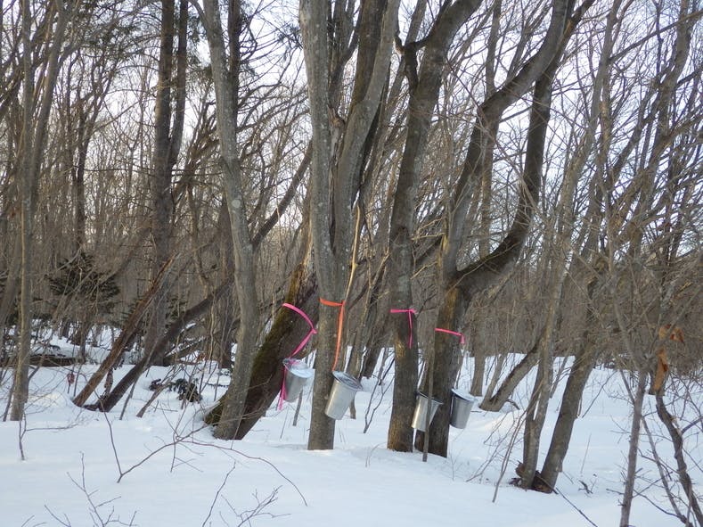 春先の芽吹く直前、大沼流山牧場の森でイタヤカエデの樹液を採取します。 1年の中で3月が一番樹液を吸い上げるので、その時期に樹液を採取します。