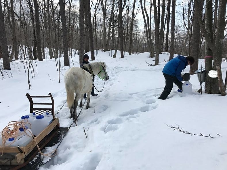 樹液は、どさんこの力を借りて、馬そりで集めてまわります。 樹液採取しやすいように、道の整備や、森林整備を進め、里山保全の活動を同時にすすめていきます。