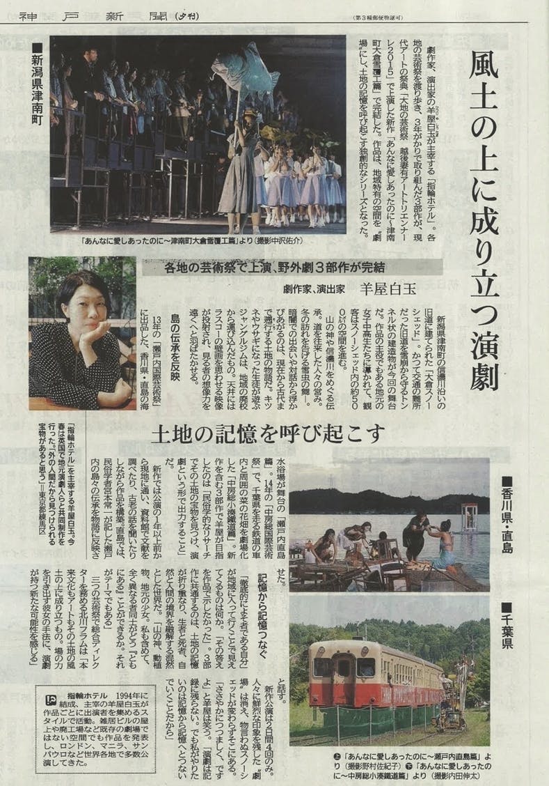 指輪ホテルの芸術監督である羊屋白玉は、「民俗学的なリサーチでその土地の宝物を見つけ、演劇という形で出力」してきました。その土地の記憶を呼び起こすような象徴的場所である、海や、鐵道や、トンネルで、劇場空間をつくりあげてきました。その作品たちは、「瀬戸内国際芸術祭」や、「中房総国際芸術祭いちはらアート×ミックス」や、「大地の芸術祭 越後妻有アートトリエンナーレ」で上演されました。そして、その土地に住む方たちと協働し上演された作品たちは、従来の「市民劇」という定義を刷新するものでした。三つの芸術祭で総合ディレクターを務める北川フラム氏は「本来文化もアートもその土地の風土の上に成り立つもの。場の力を引き出す彼女の手法は、演劇の新たな可能性を感じさせる」と、そうおっしゃってくれました。