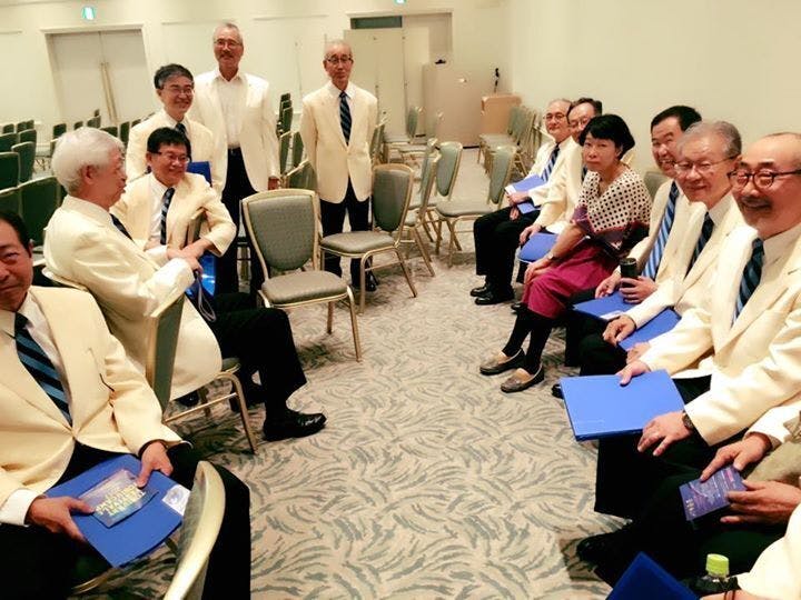 コール・ヴォイジャーズ苫小牧男声合唱団のみなさんと、作品のうちあわせする羊屋白玉
