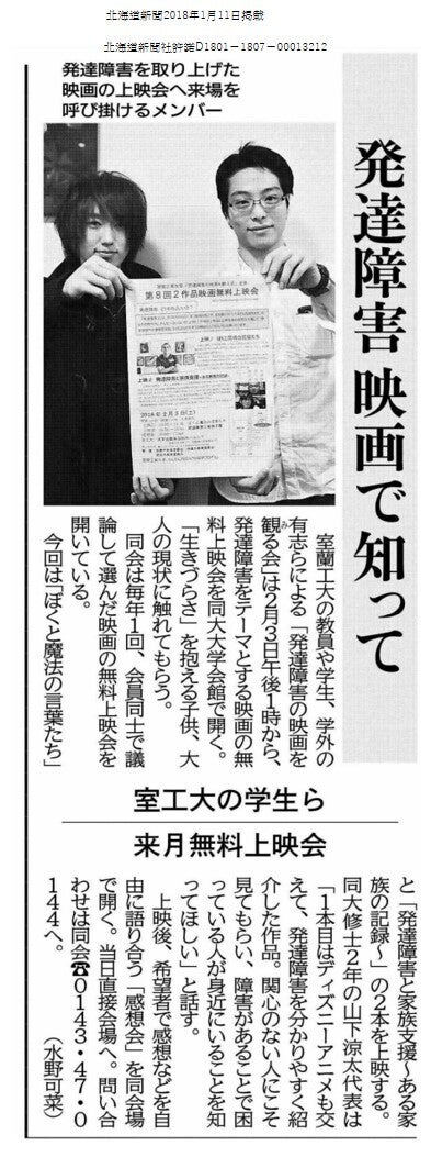 2月3日の上映会実施準備として、上映作品(2作品)の選定、会場の確保(室蘭工業大学多目的ホール)、映画製作会社などとの映画上映権の交渉、チラシやポスター等の宣伝物デザインと準備、宣伝物配布と掲示依頼(大学構内数カ所、市の大規模施設、障害者関連施設、病院など、既に多くの場所に配布・掲示依頼済み、)新聞社からの取材を済ませています。