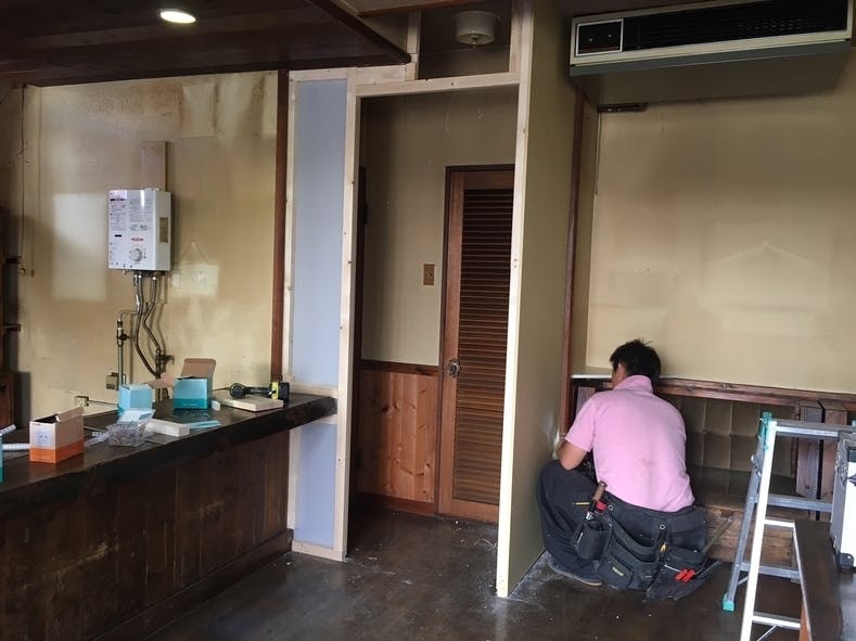 これは、なにもなかったところに敏腕大工さん2名が壁を作ってくれているところです。できあがりも今度載せますので、お楽しみに。