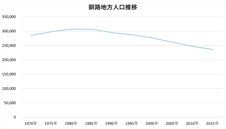 釧路地方の人口は2015年の国勢調査によると計236,516人。前回2010年時は247,320人でしたので、わずか5年間で4.4%(25人に1人)も人口が減ってしまいました!