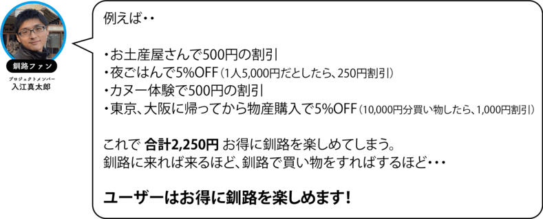 現在考えているのは年会費1,600円で1年間、釧路の観光や物産の購入などをお得に楽しめるものです。会員証を作り、それを各所で提示することで釧路の旅を楽しむことができるようになります。