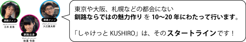 今回のプロジェクトメンバーは釧路の地元の方々と、関西にいる出身者・地域ファンで作っています。大阪・京都を中心として観光都市として発展を続ける関西と釧路で一緒にファンクラブを立ち上げることで、東京から立ち上げることでは養えない視点で長きに渡り、釧路の産業を作ります。
