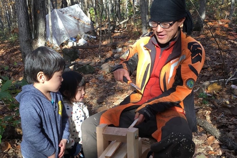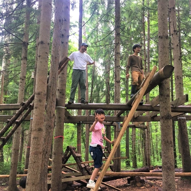 ツリーハウスを少しずつ、みんなでつくる原さん(右)