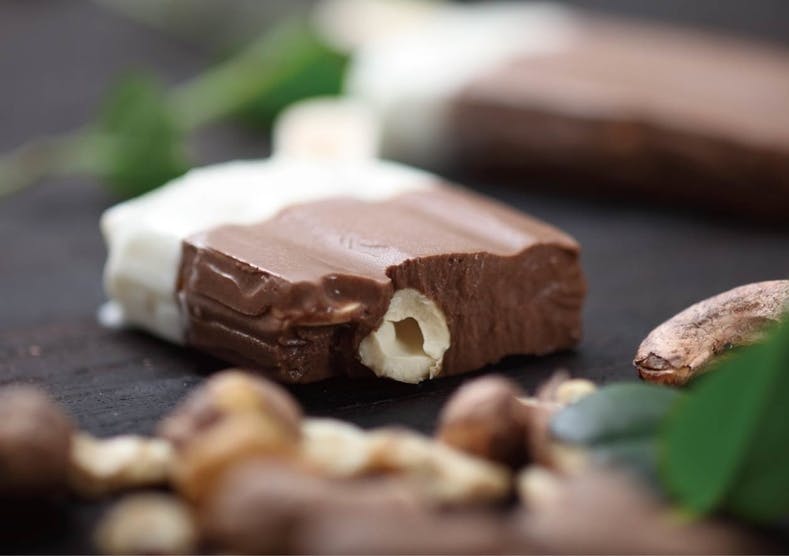 クーベルチュール カカオ65%使用、ビターな風味が特徴のチョコレートアイスの中には大きいカシューナッツがまるごと1個!そして下部には北海道天塩町「宇野牧場」の牛乳を使用したバニラミルクアイス。一番下にクラッシュカシューナッツがたっぷり入っています!