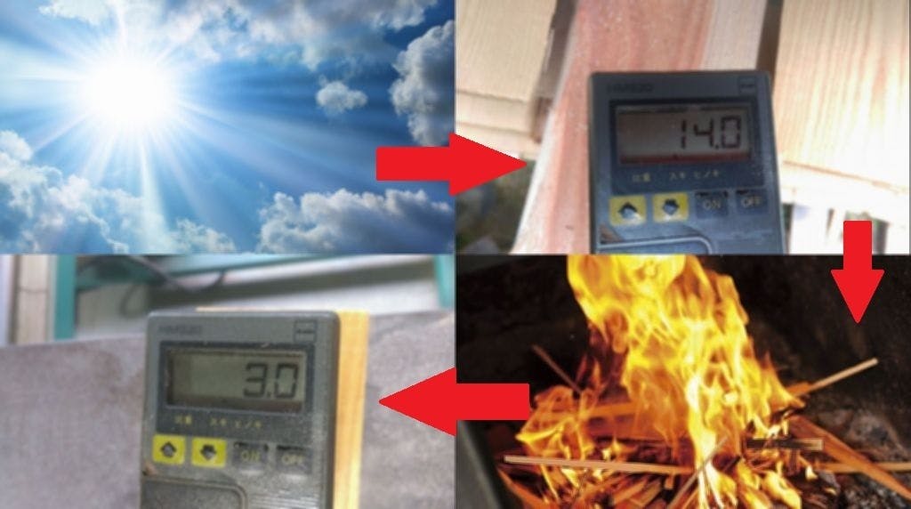 杉は含水率が高く、伐採したばかりでは150~300%にもなるって言われてます。そこから住建材として使えるようにどんどん下げていく=乾かしていく、わけですね。