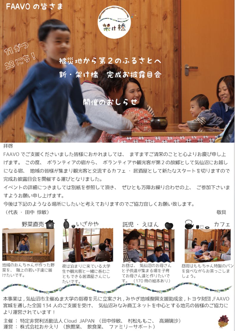 2016/11/26 03:31いつもお世話になっております! 気仙沼ゲストハウス”架け橋”の田中惇敏です! やっとこさ、完成お披露目会の開催までこぎつけました! 完成お披露目会は、オープンなイベントではなく、まずはFAAVOの皆様はじめ特にお世話になった方のみのシークレットイベントとなっております。 下記ご参照の上、お時間ありましたら是非遊びにお越しください! お越しいただける方は事前に info@kakehashi0311.com までメールをいただけると幸いです。 また、12月からはいつでもお越しいただけますので遠方の方は、現在絶賛郵送準備中のご招待券をお持ちして遊びにお越しください!! もっと見る